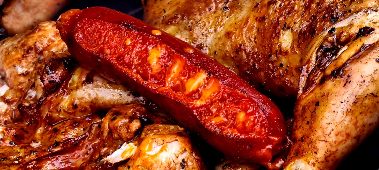 Carne y costillas de cerdo, arroz, frijoles, salsas, salchichas, tortillas