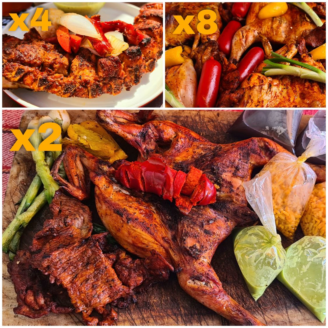 1 pollo y medio, 4 guarniciones de arroz, frijoles, salsa de guacamole y tortillas, (si pagas en efectivo te enviamos guarniciones extra o orden de salchichas.
