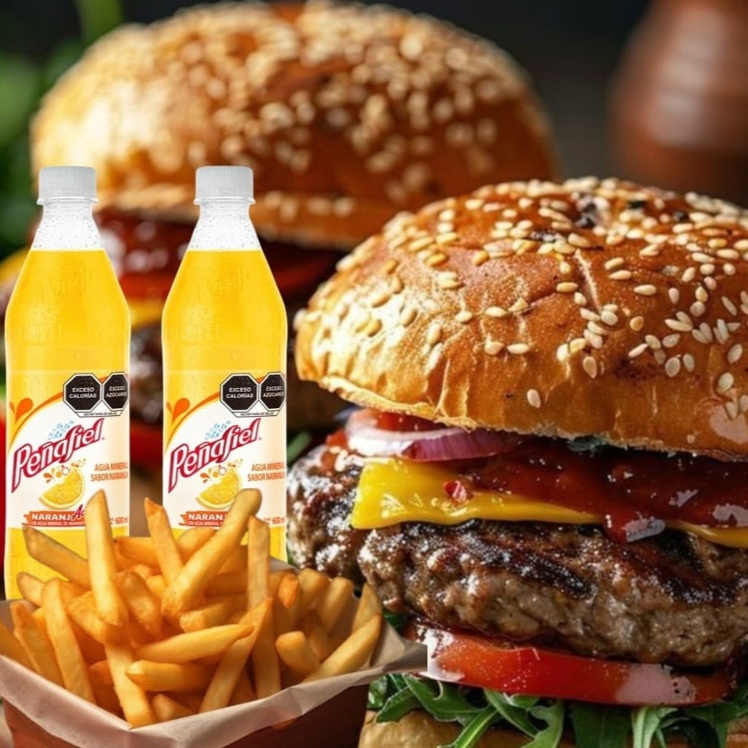 2 hamburguesas de res 1 orden de papas 2 refrescos o agua a escoger
