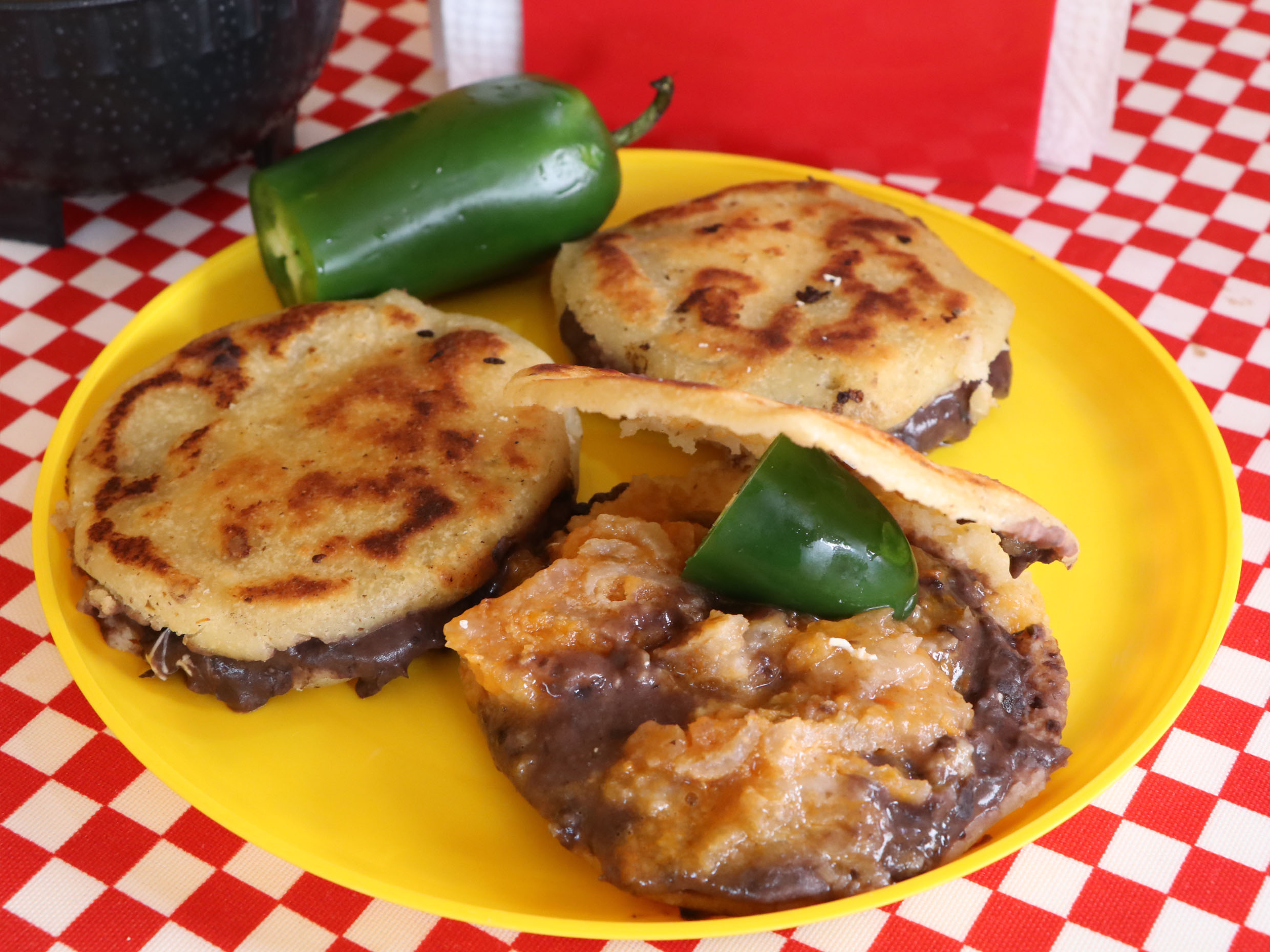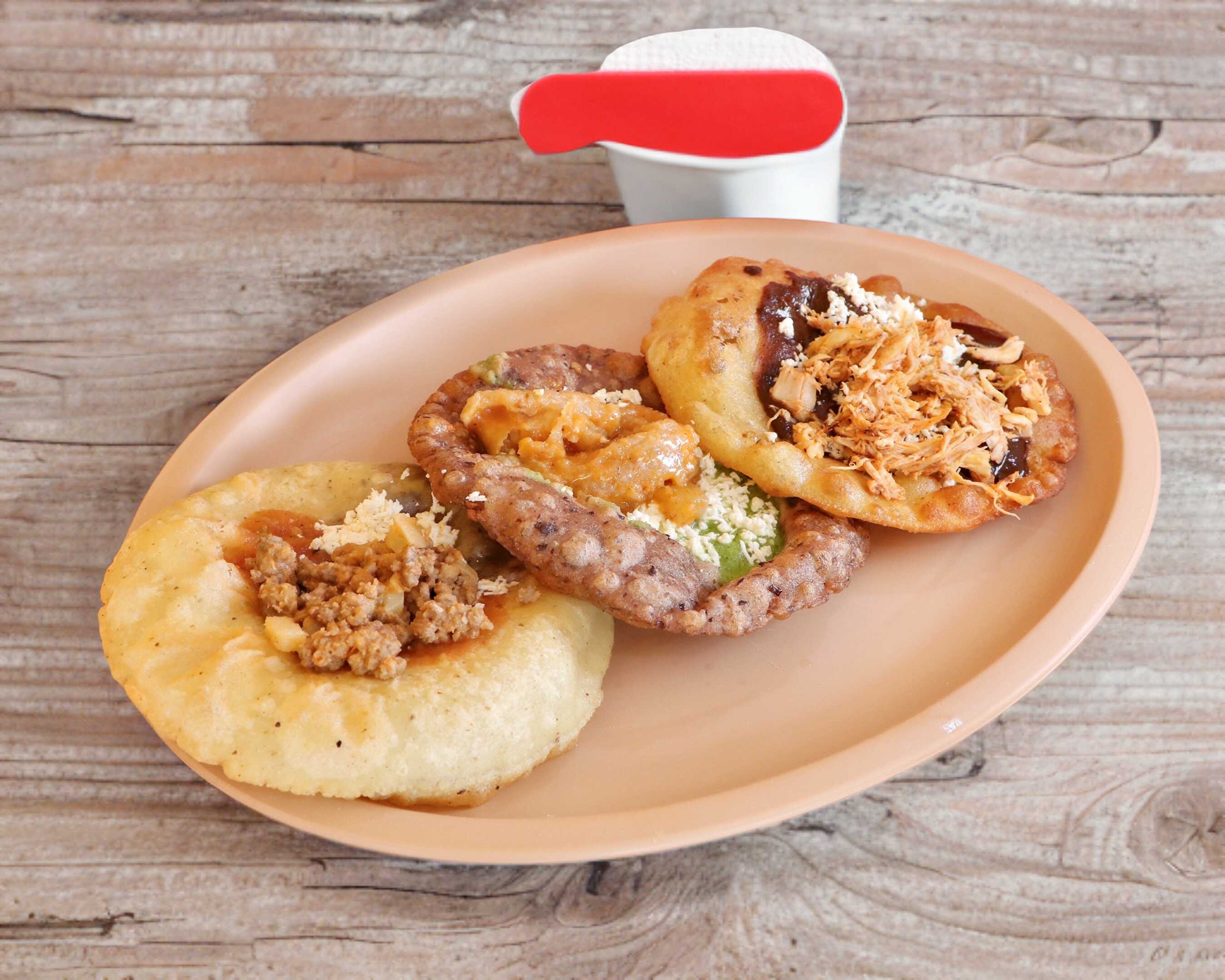 3 tortitas de masa rellena de frijol, un guiso y una salsa de tu elección.