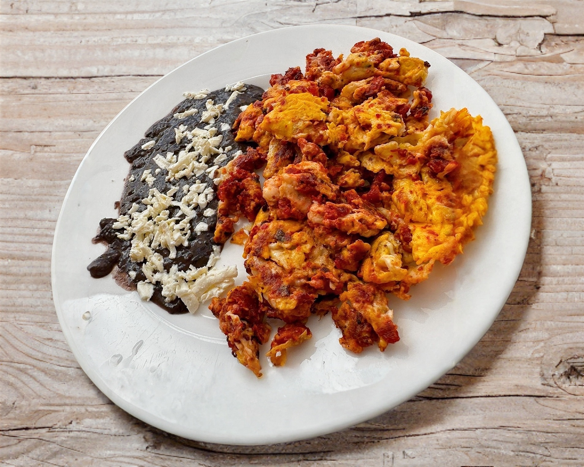 huevo revuelto mezclado con frijol seco acompañado de chile, cebolla y tortillas