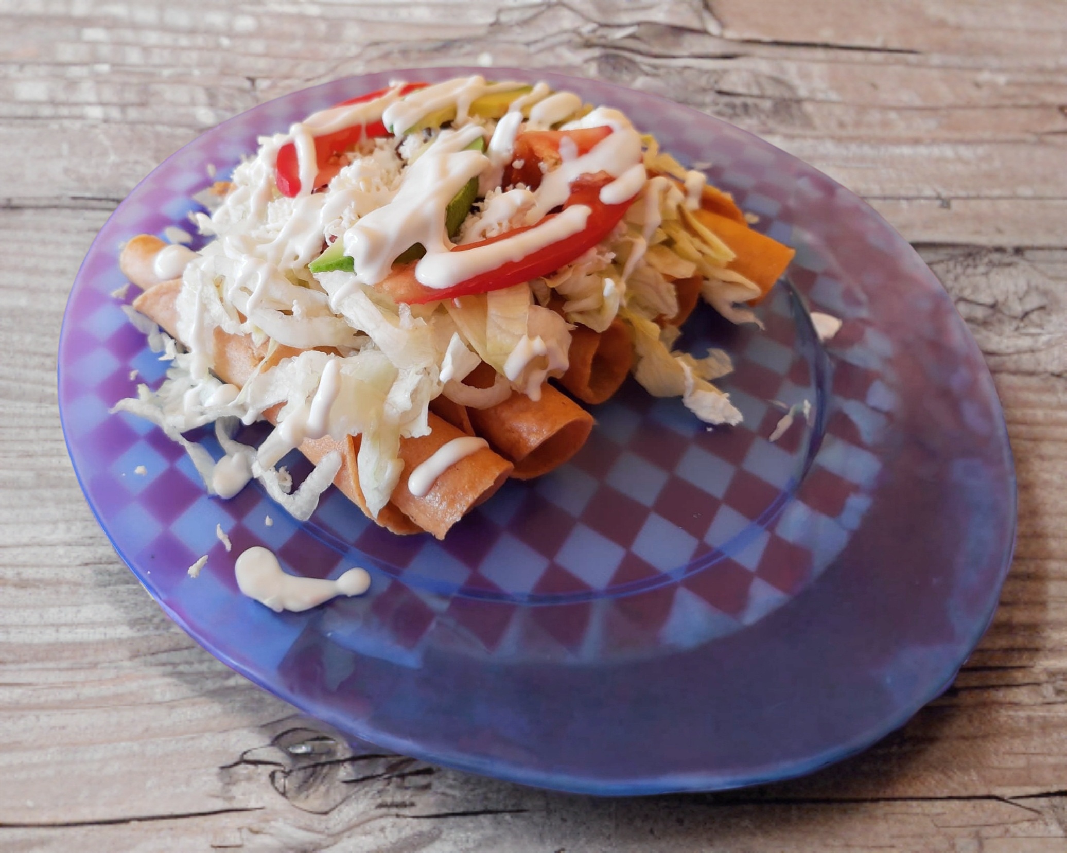 5 tacos dorados de pollo, con lechuga, queso, jitomate, aguacate, salsa.