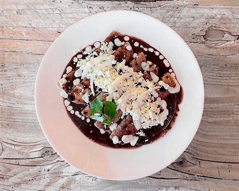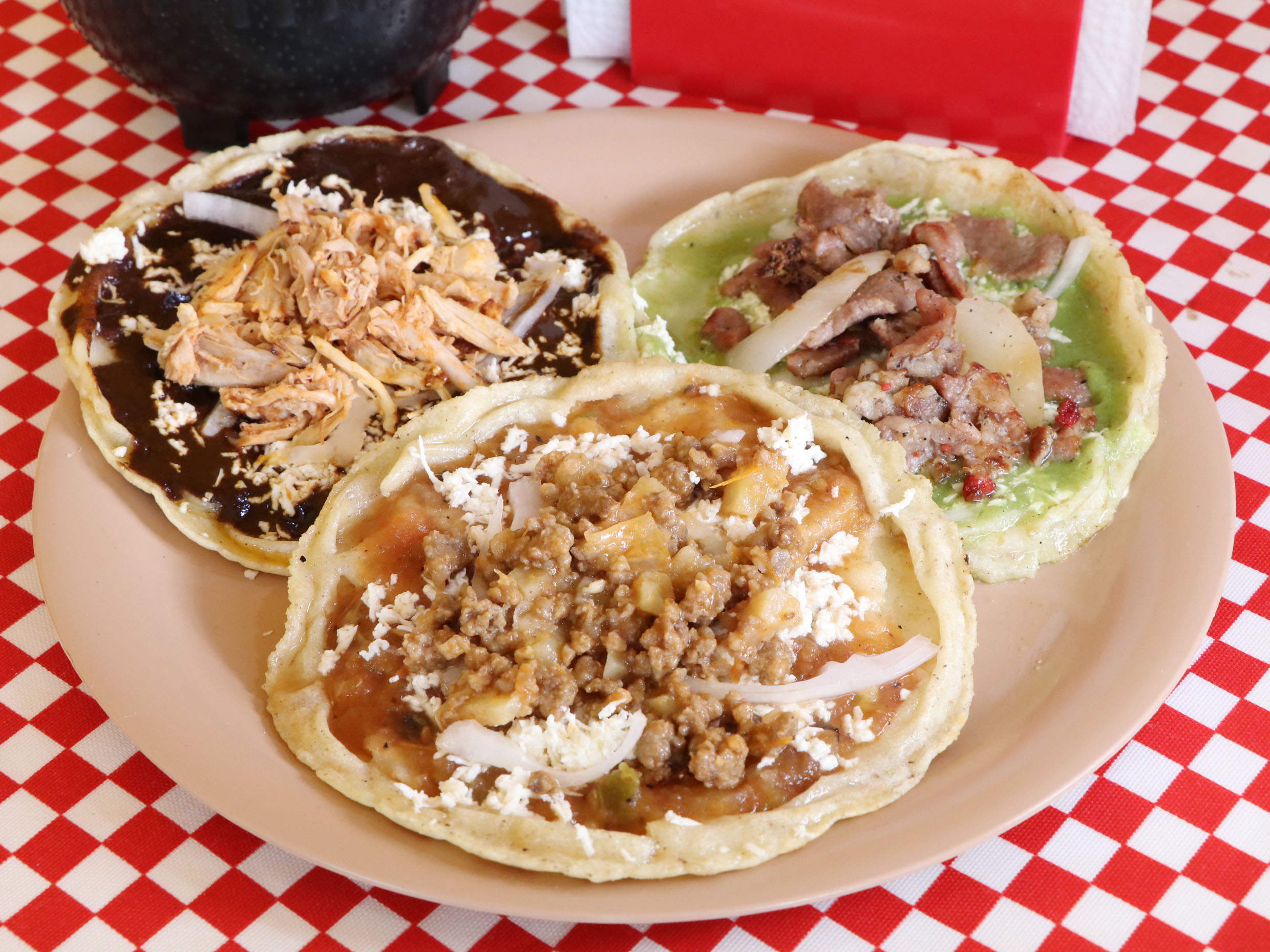 3 tortillas de masa blanca, negra o dulce, con salsa a tu gusto, queso y cebolla.