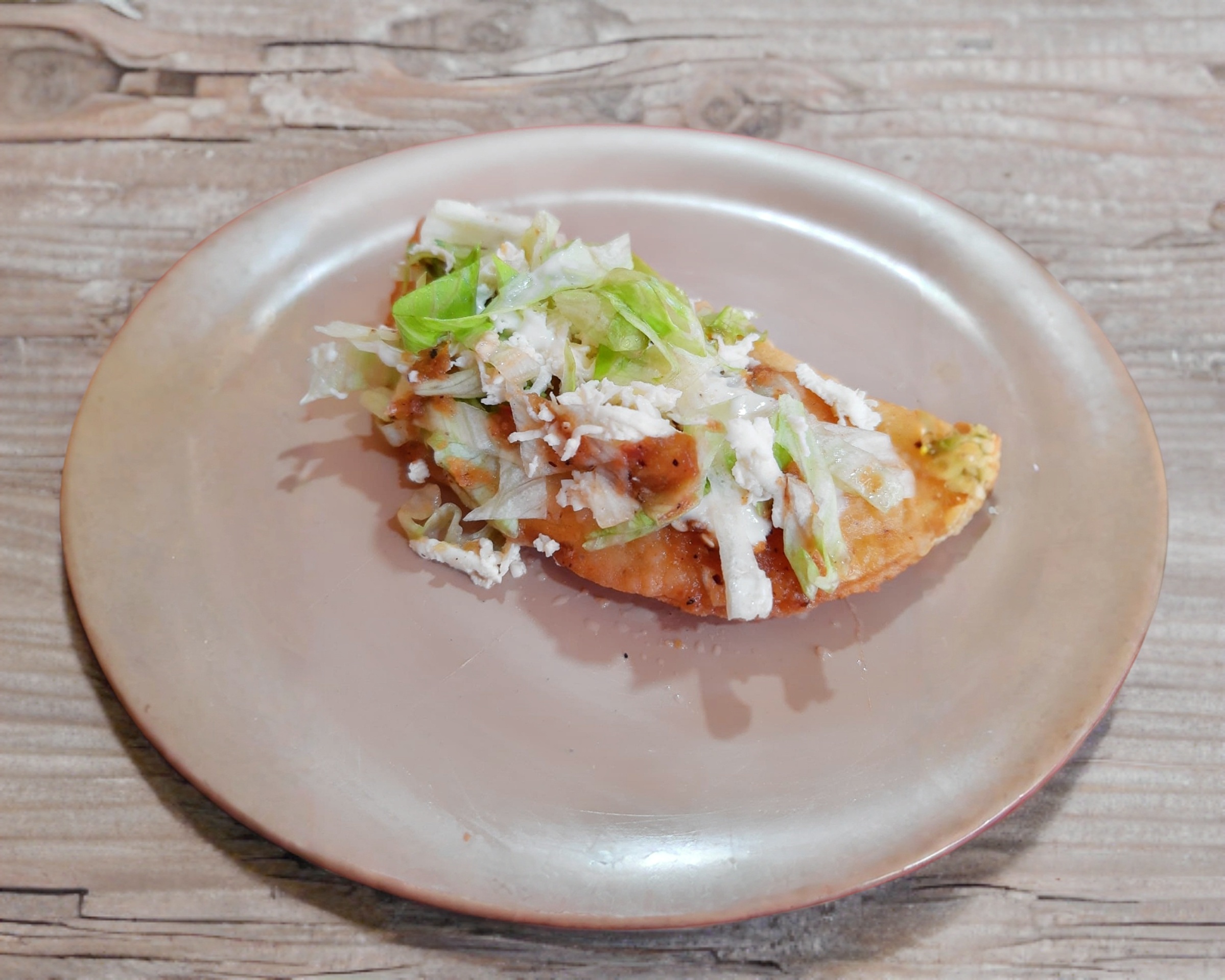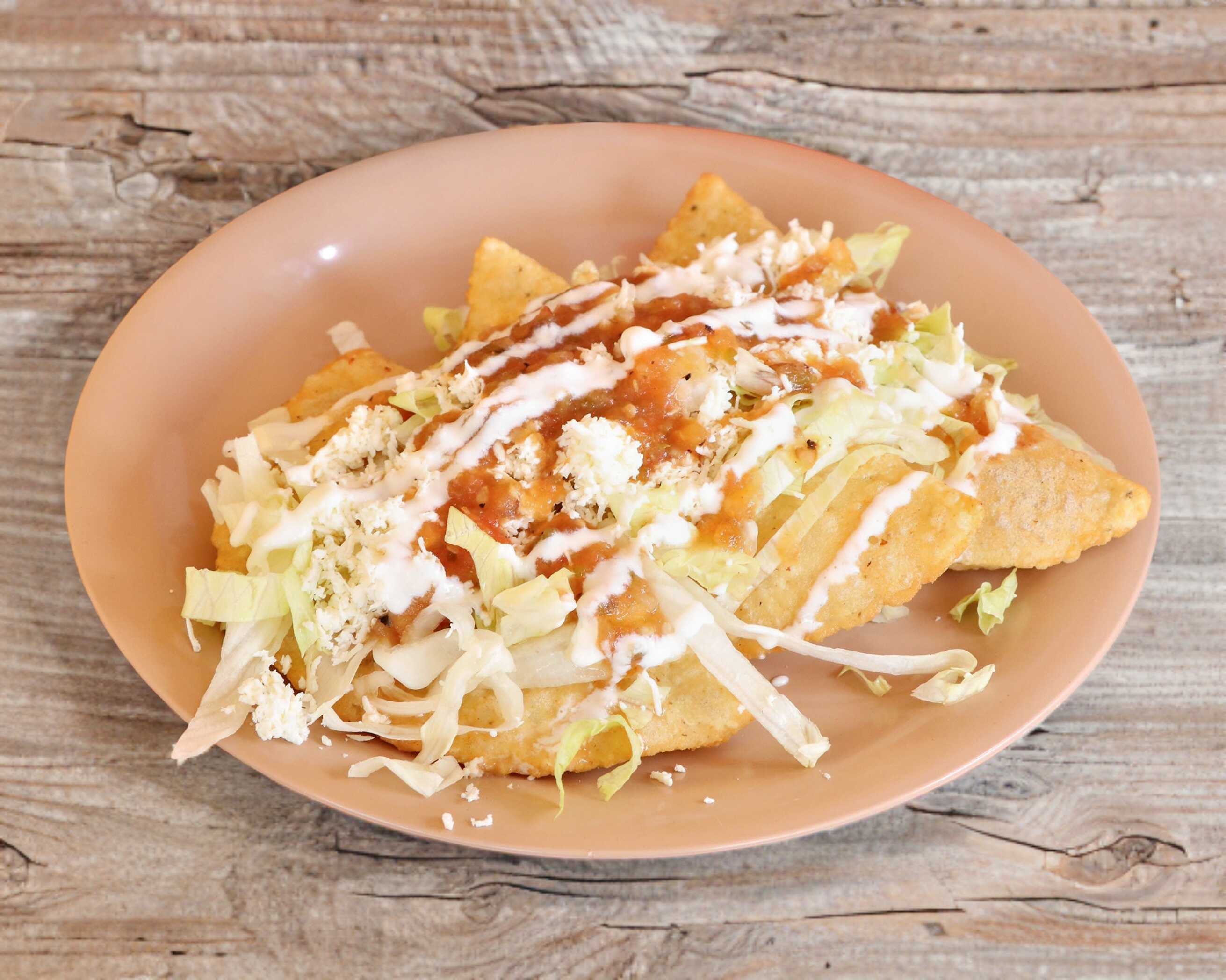 Empanada de masa frita acompañada de lechuga queso y crema con salsa y guiso a elegir.