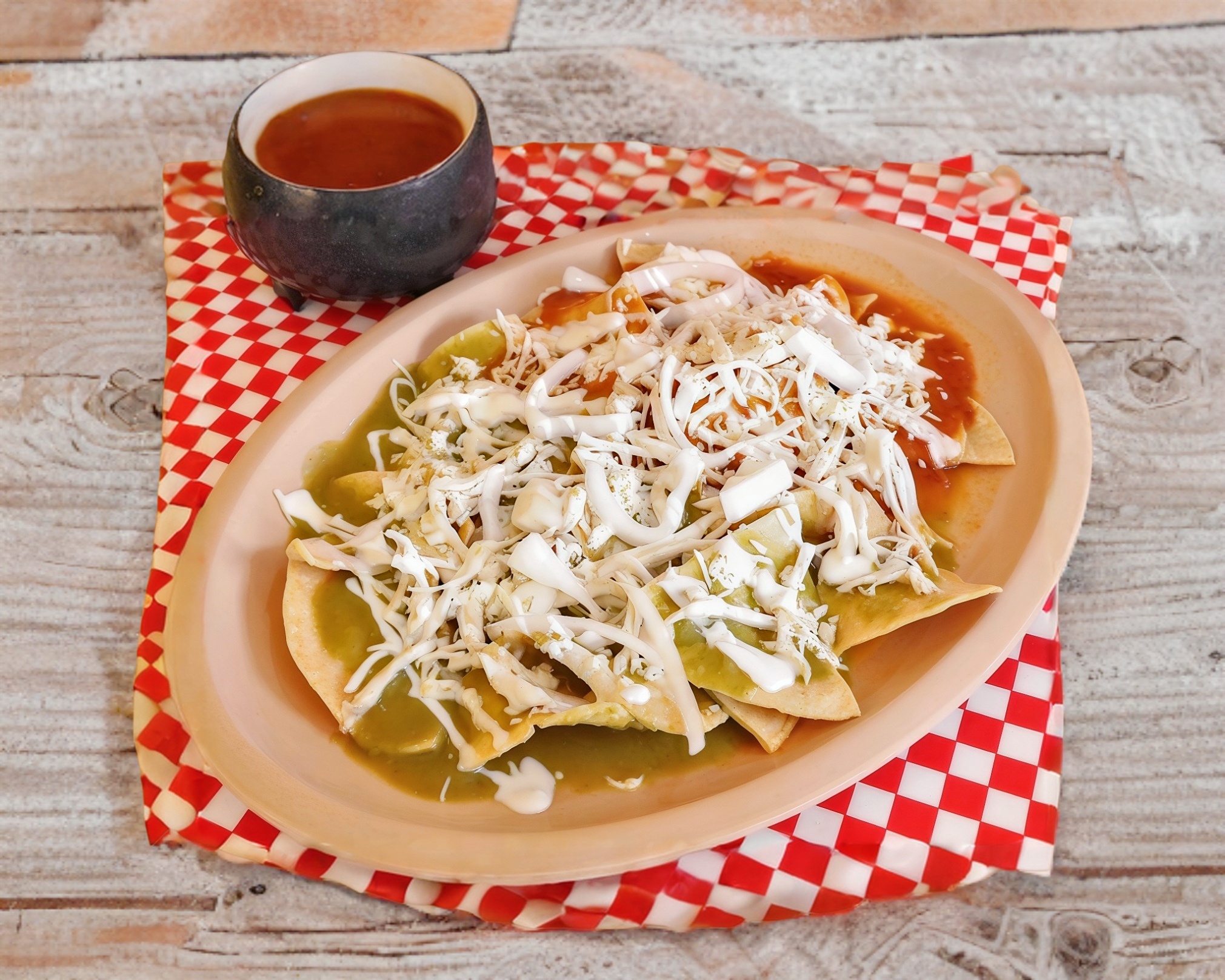 Chilaquiles rojos con queso, crema y cebolla. (platillo personal )