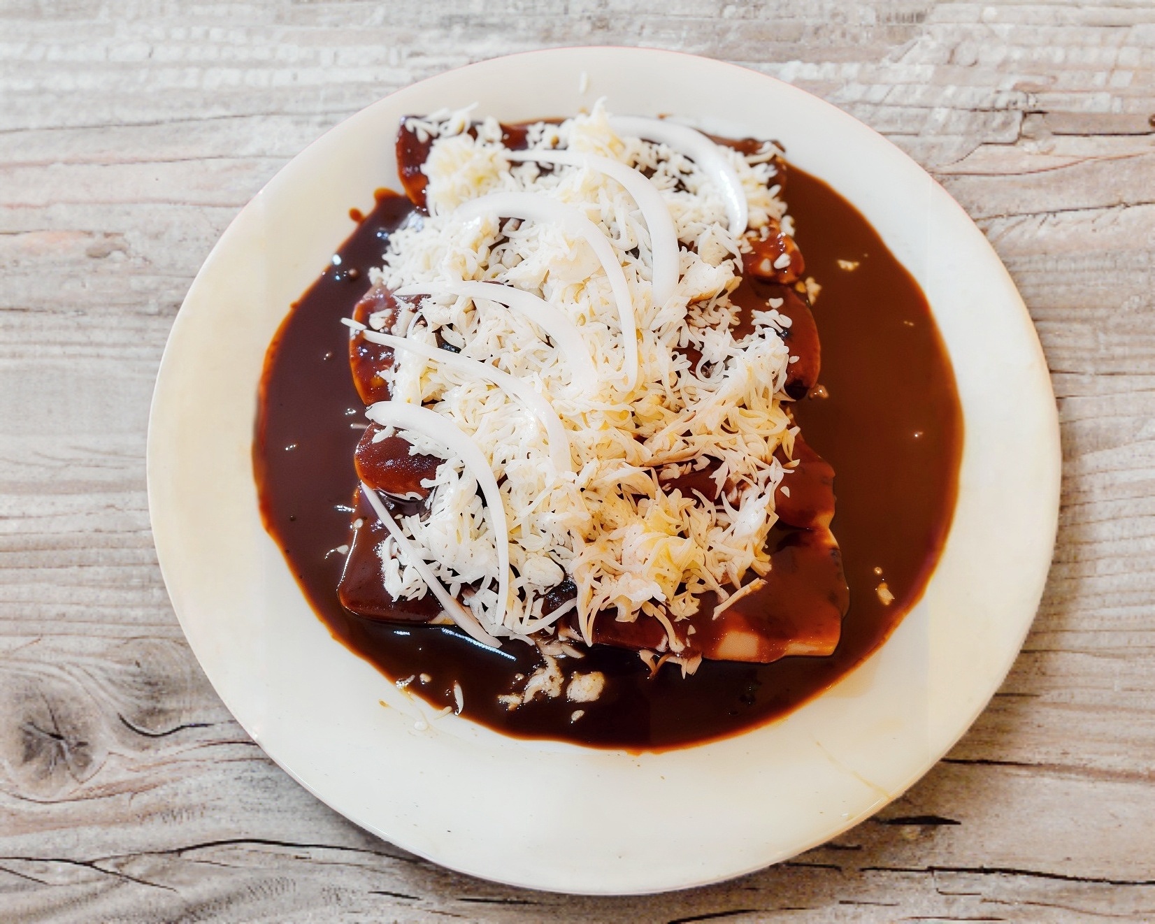 5 Tortillas rellenas de pollo, queso, crema y cebolla, bañadas en la salsa de elección.