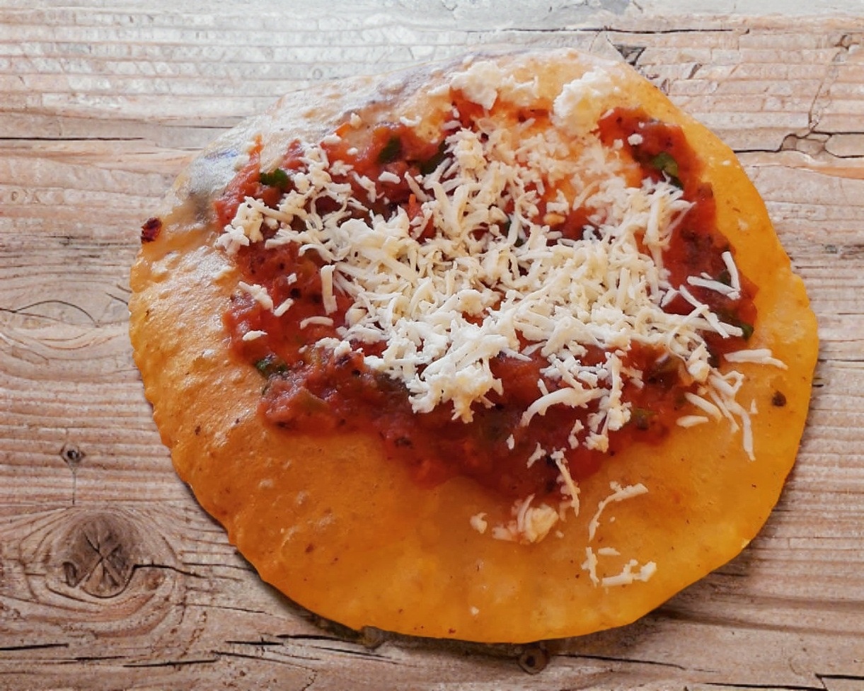 Tortilla de maíz a mano con base de salsa, queso y cebolla.