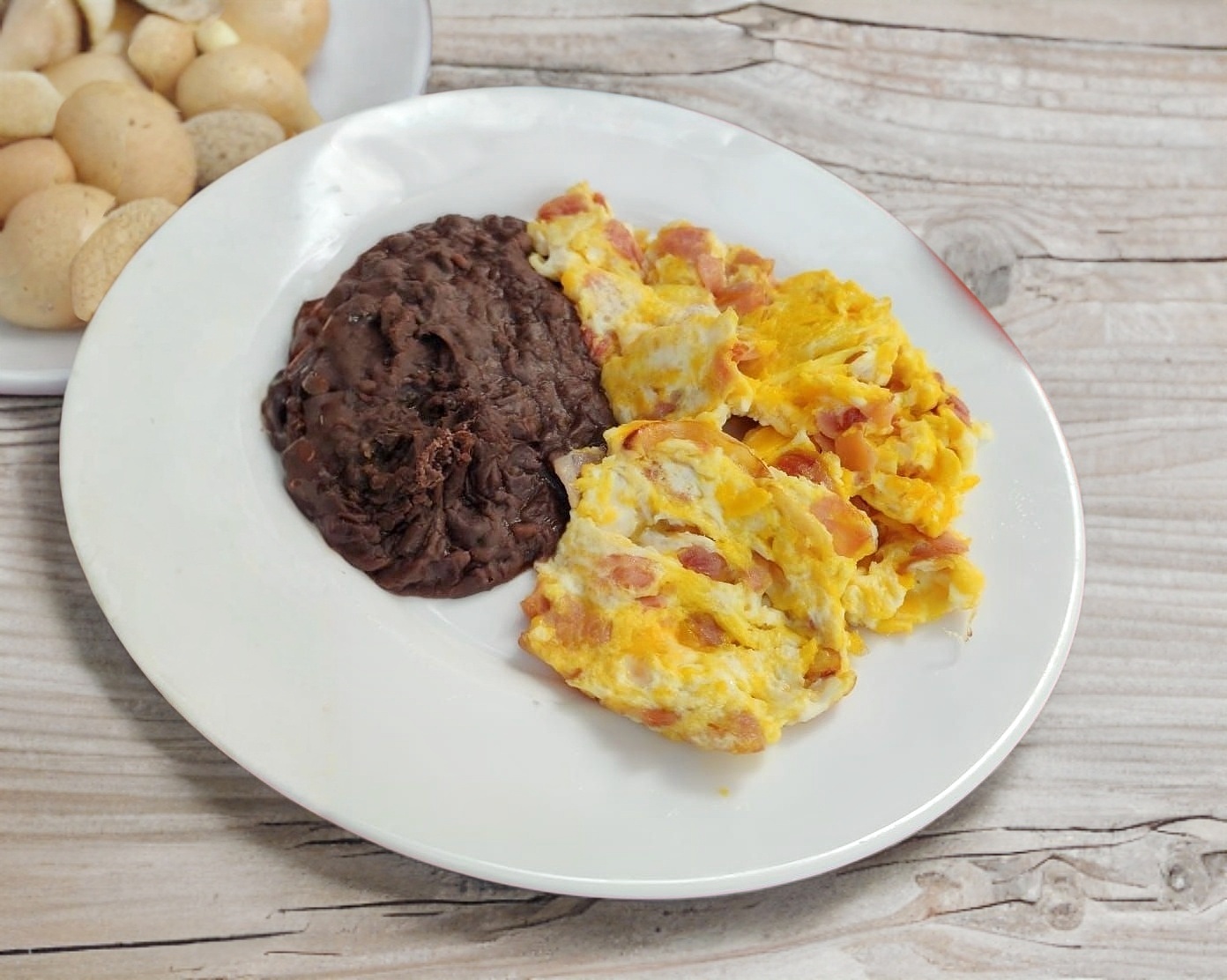 3 piezas de huevo con jamon acompañado de frijoles refritos y tortilla