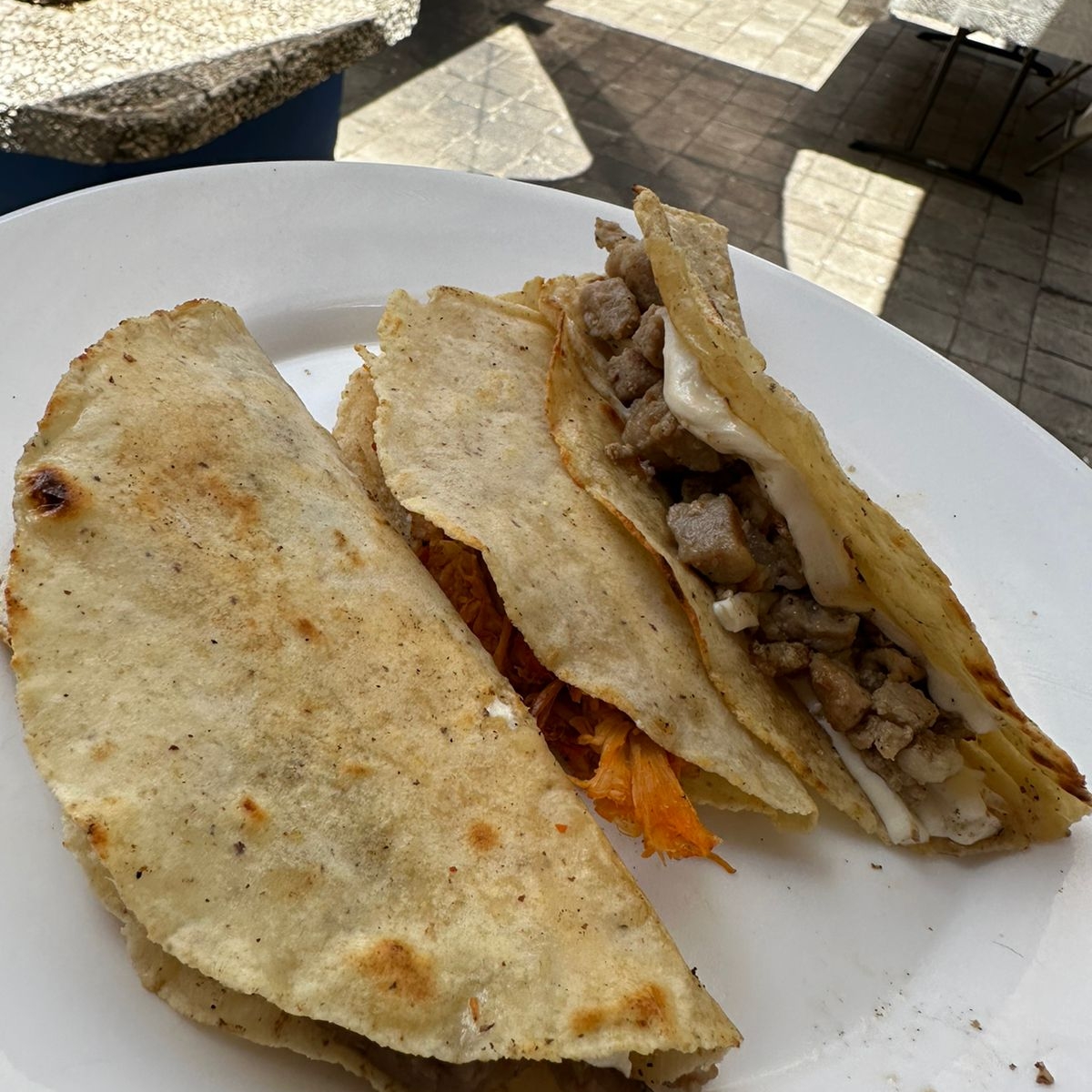 3 tortillas a mano de masa doblada a la mitad, con queso oaxaca y un guiso de tu elección.