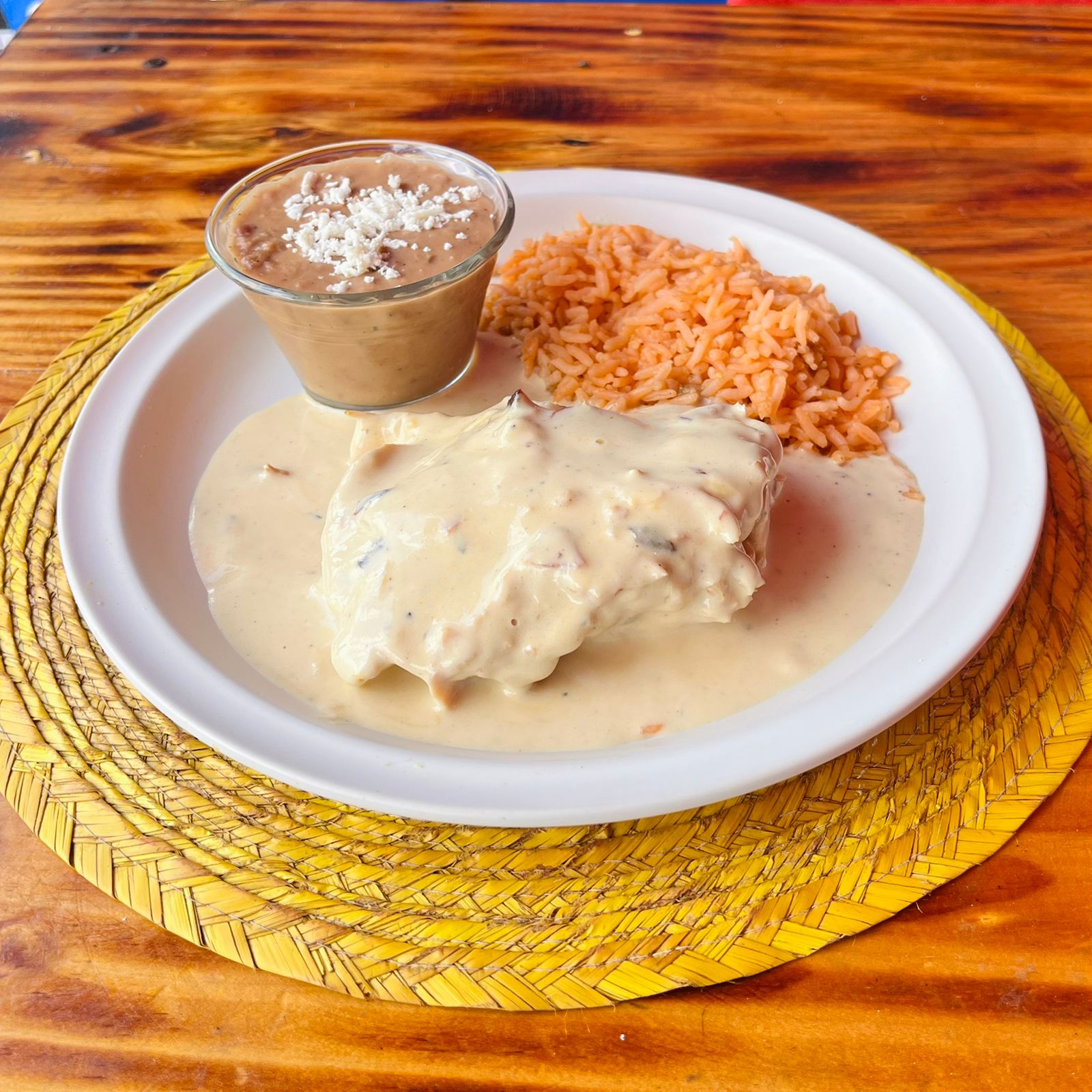 Incluye arroz y frijoles. Acompañado de tortillas y salsa.