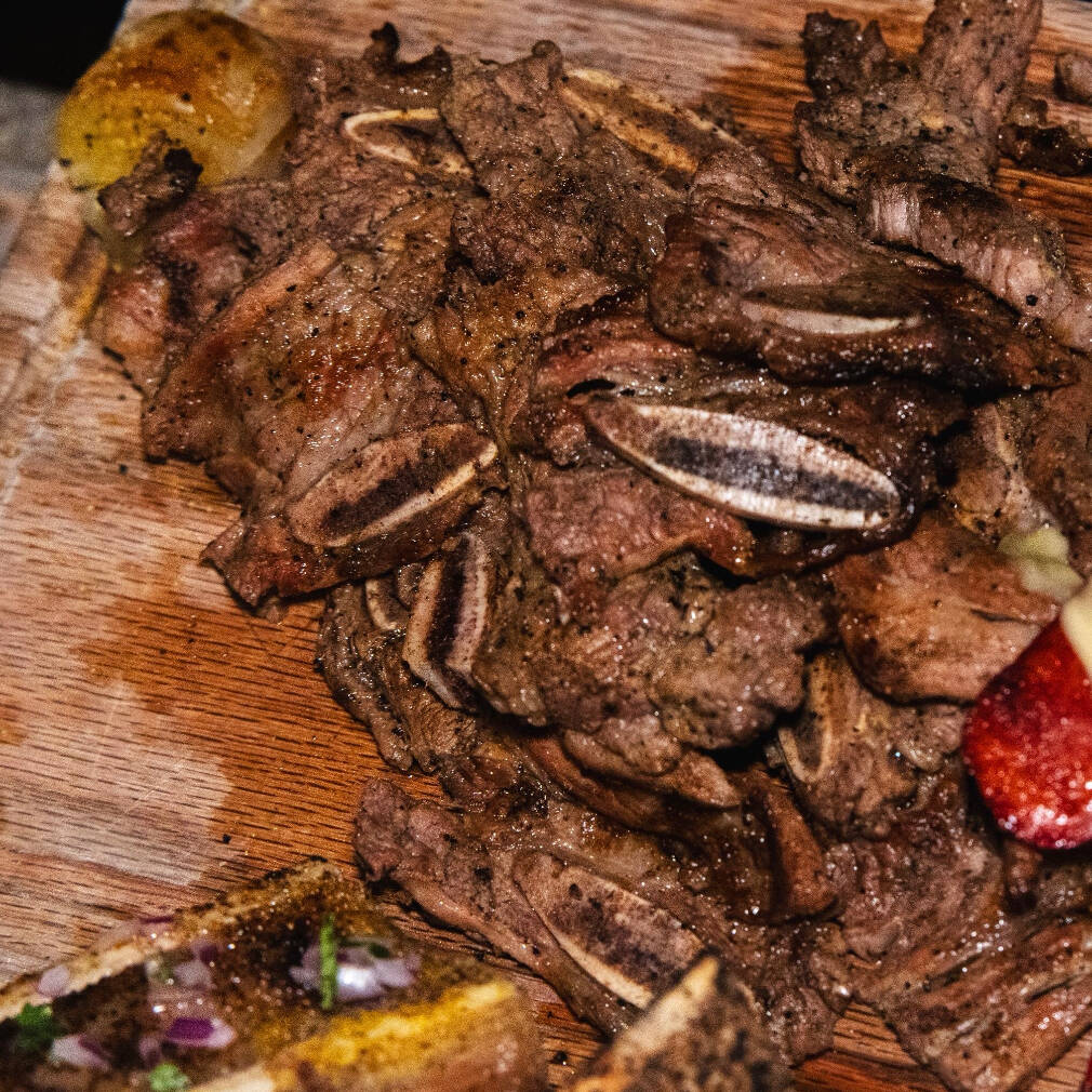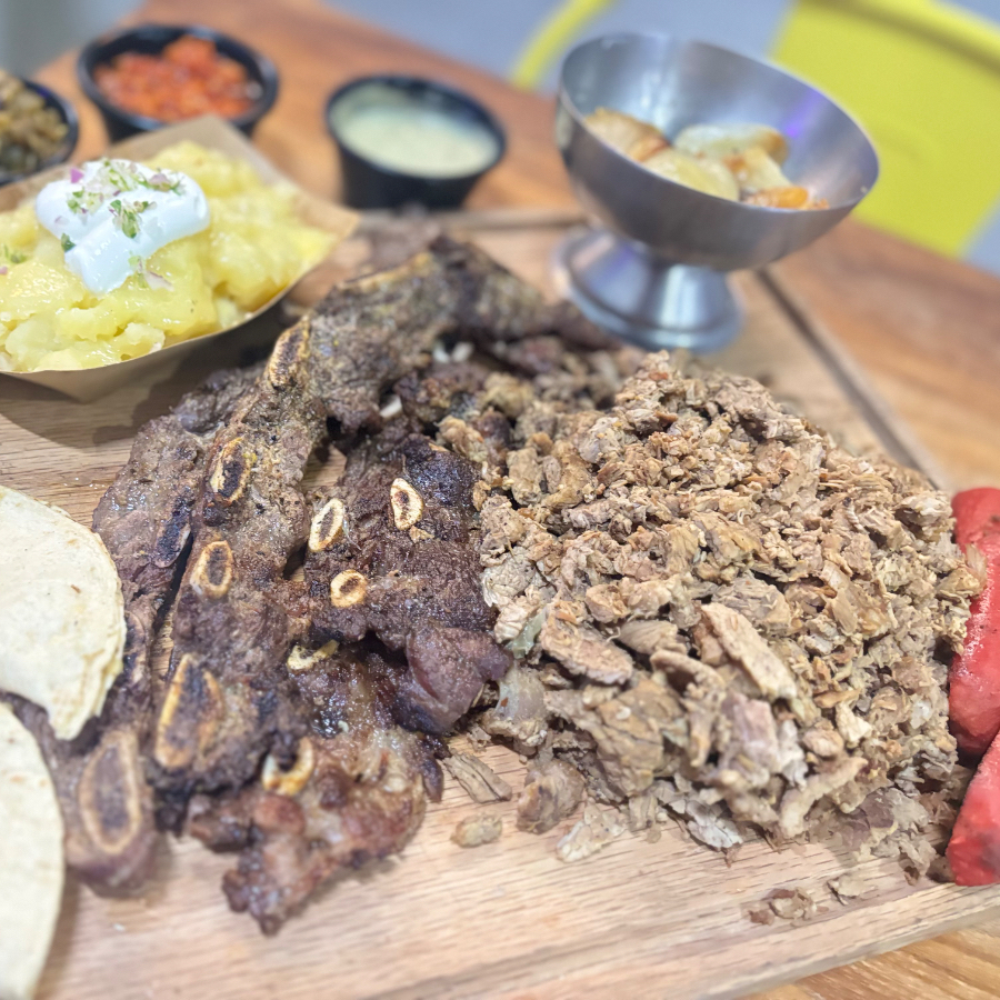 Medio kilo de costilla asada de res*1 + Medio kilo de carne asada de res*1 + Papa asada con mantequilla, crema y queso derretido*1 + Orden de cebolla asadas con mantequilla*1