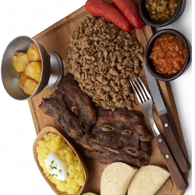 Un kilo de costilla asada de res*1 + Un Kilo de Carne Asada de Res.*1 + Orden de salchichas*1 + Quesadilla De Harina*2 + Guacamole*1 + Quesadilla de maíz*2 + Papa asada con mantequilla, crema y queso derretido*2