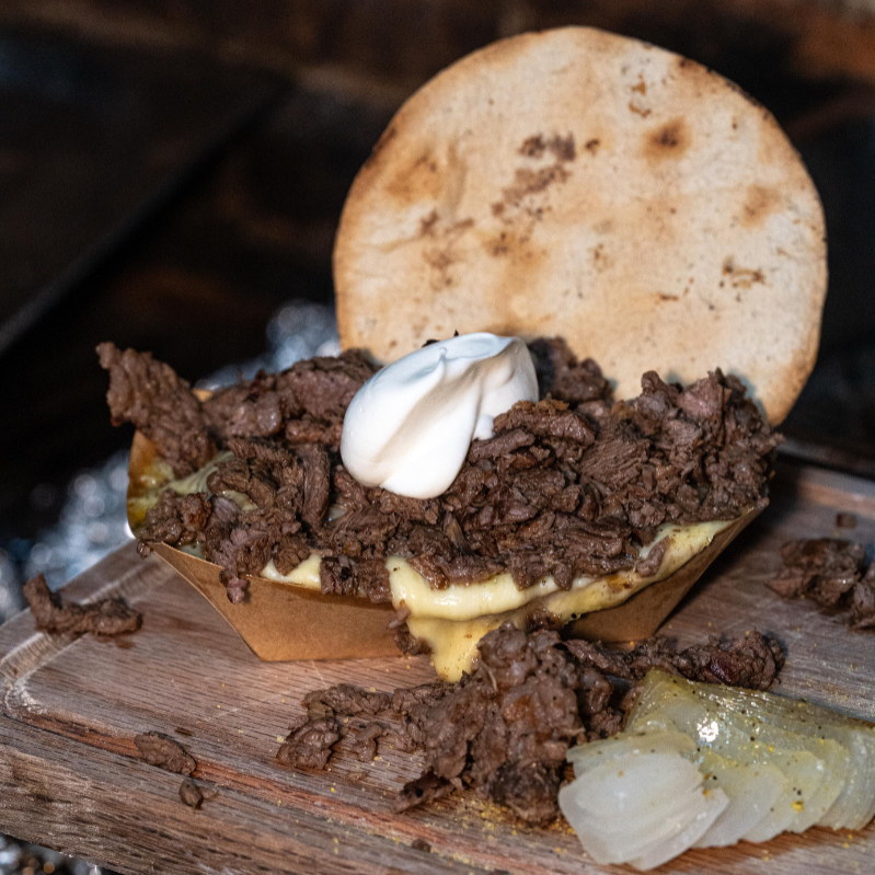 Papa asada con mantequilla, crema, queso derretido y carne asada al carbón.