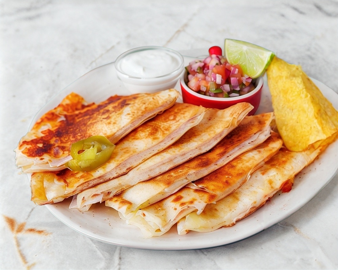 "Tortilla de Harina Jumbo, Queso Oaxaca, Jamon de Pavo Cortada en 4 Pzas, acompañado con su pico de gallo y salsa de crema habanero. "