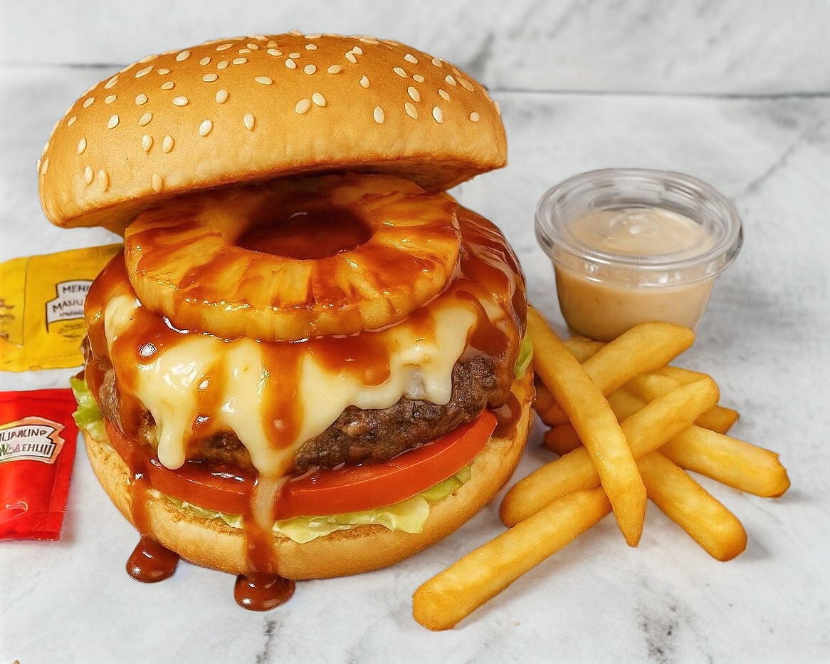 Pan Tradicional, Lechuga, 110 Gr de Carne de Res Con la Receta Casera, Queso Manchego, Piña,Salsa BBQ, Jitomate, Cebolla y Papas Porcion 100 gr