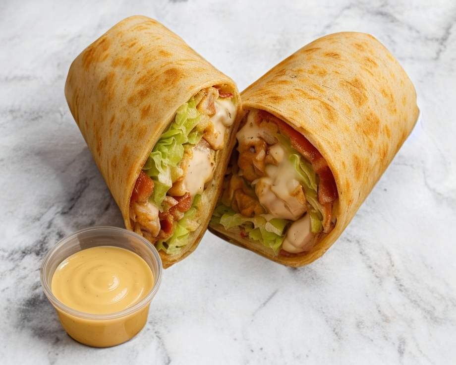 Tortilla de Harina Jumbo, frijol, lechuga, queso, Pechuga a la plancha , acompañados con su salsa de crema habanero.