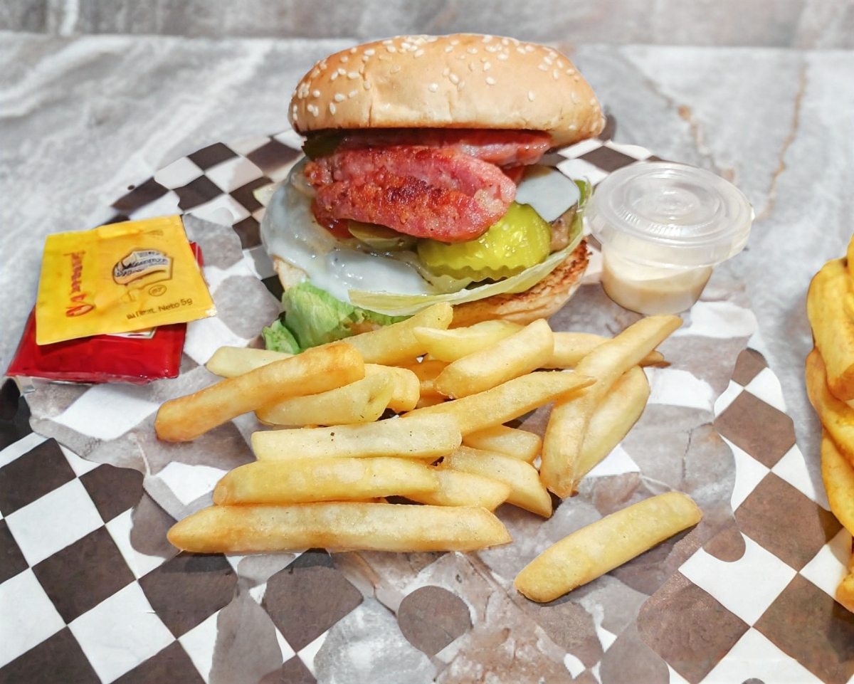 Pan Tradicional, Lechuga, 110 Gr de Carne de Res Con la Receta Casera, Chistorra Queso Manchego,2 Aros de Cebolla,2 pzTocino Crujiente, Jitomate,Pepinillos, Cebolla y Papas Porcion 100 gr