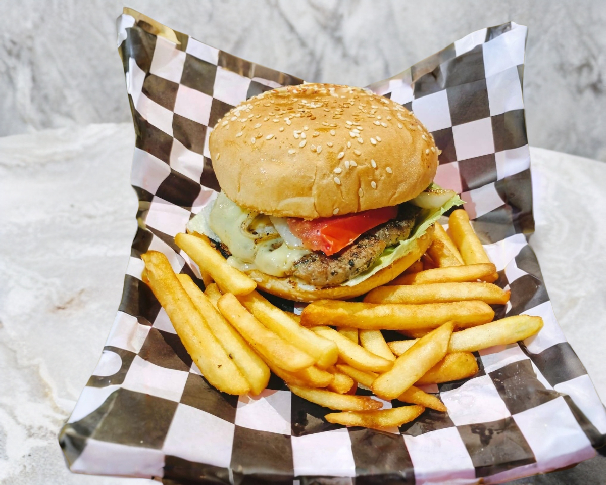 Pan Tradicional, Lechuga, 220 Gr de Carne de Res Con la Receta Casera,Doble Queso Manchego, 2 Aros de Cebolla, Jitomate, Cebolla y Papas Porcion 100 gr