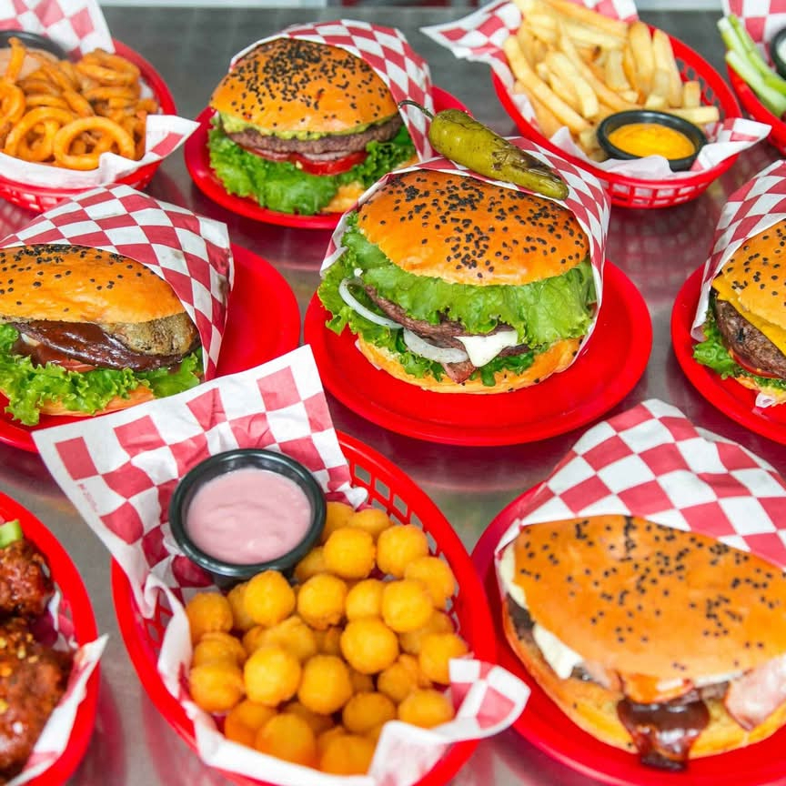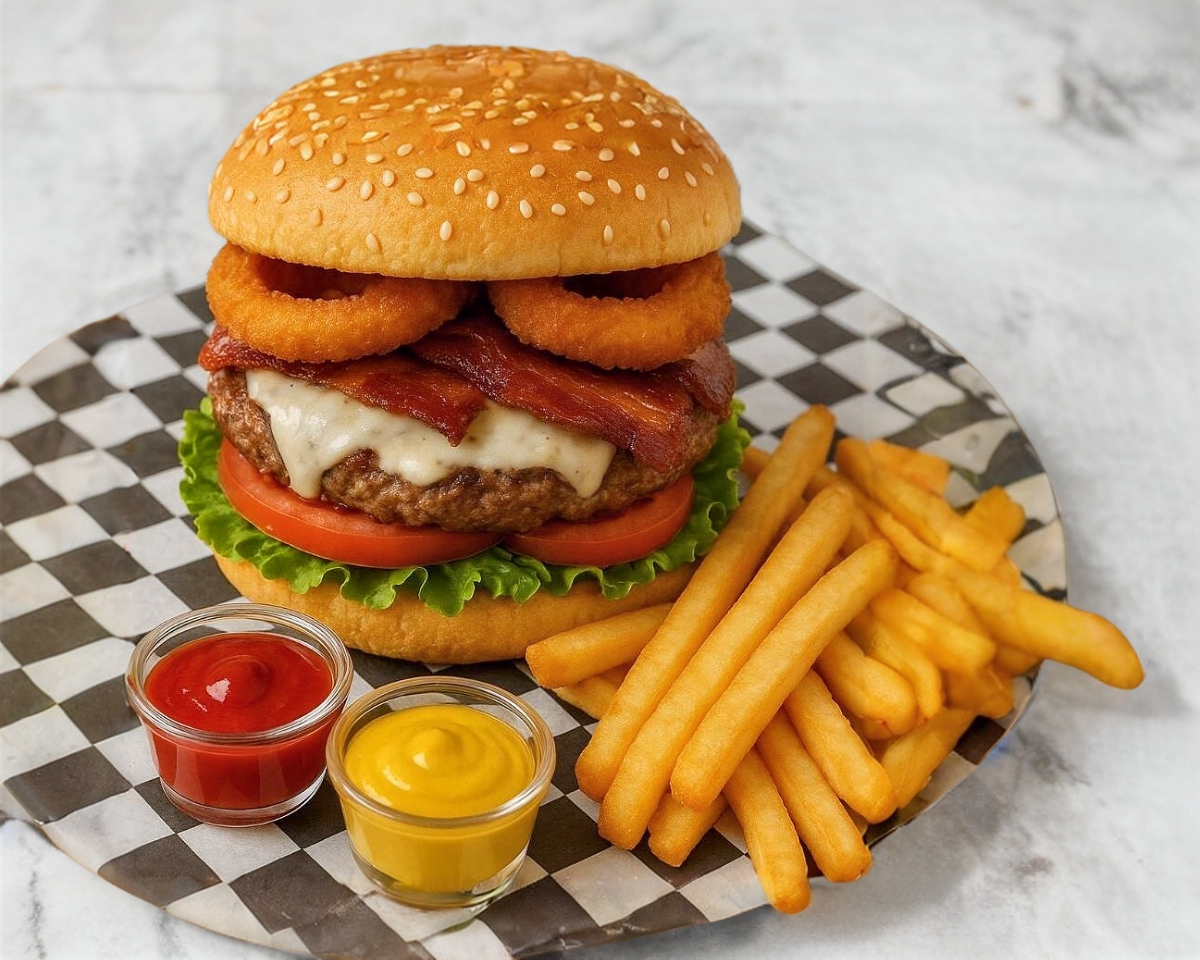 Pan Tradicional, Lechuga, 110 Gr de Carne de Res Con la Receta Casera, Queso Manchego,2 Aros de Cebolla,2 PzTocino Crujiente, Jitomate, Cebolla y Papas Porcion 100 gr