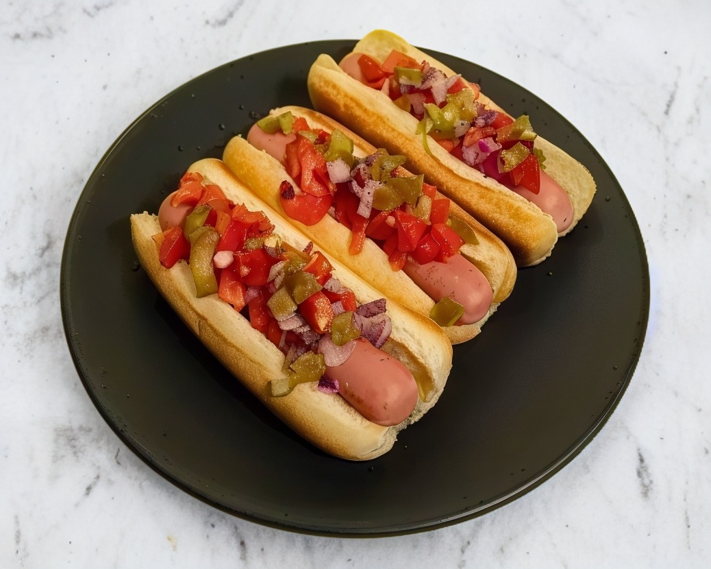 Pan Hot Dog, Mayonesa Salchicha de Res,Jitomate a Elegir Cebolla Caramelizada o natural, Jalapeño, Pepinillo, Mostaza