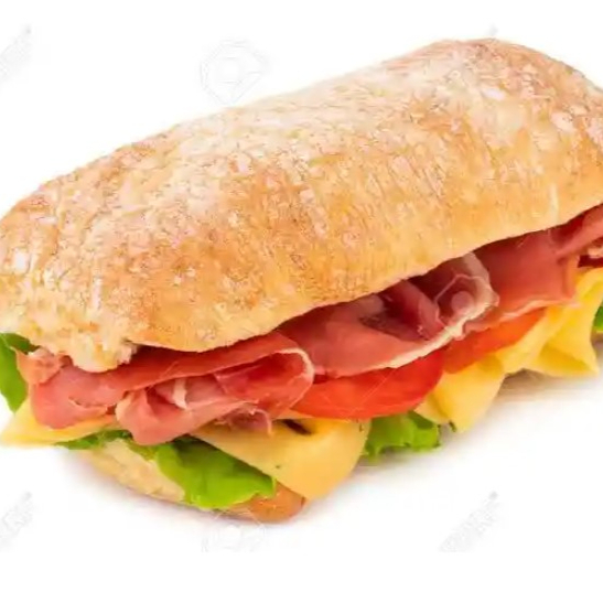 Pan estilo italiano Chapata,Jamon de pavo, Mayonesa Queso Oaxaca-o manchego , Lechuga, Jitomate Cebolla , y Salsa de Crema Habanera