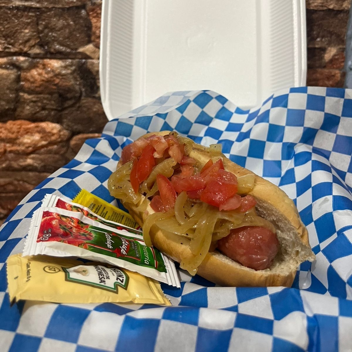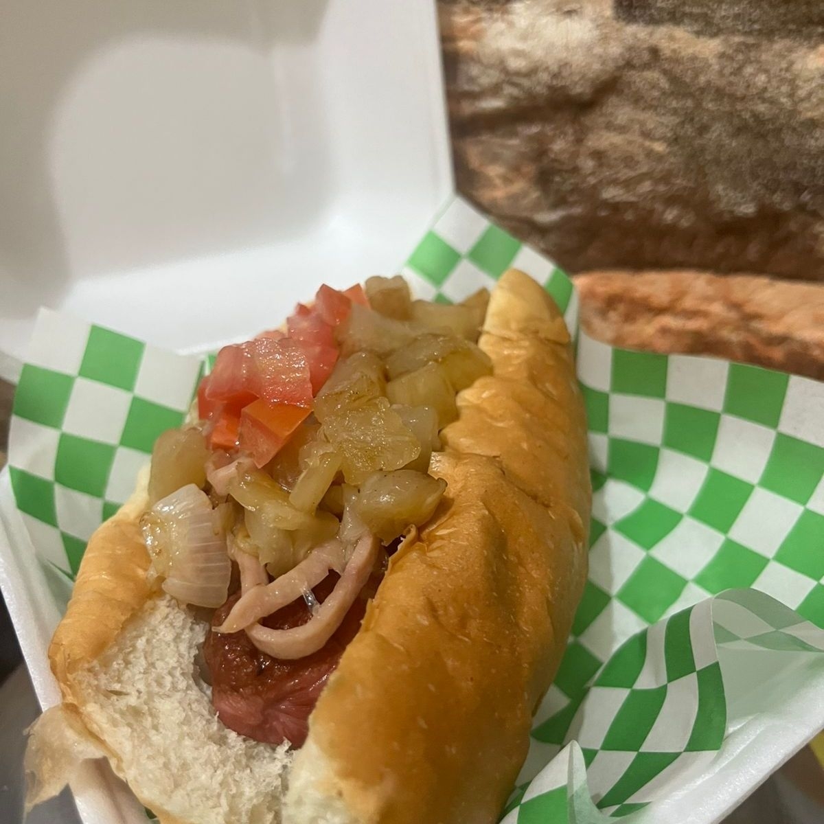 Q manchego salchicha pavo jumbo cebolla asada y tomate mas un tosino delicioso