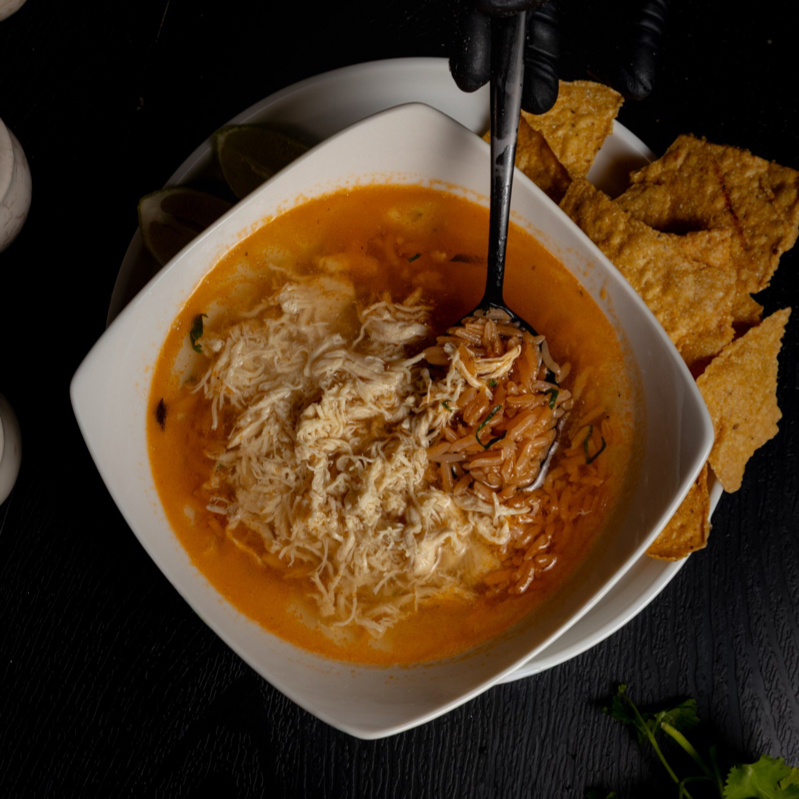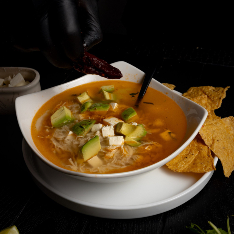 Sustancioso caldo de pollo con verduras, pechuga deshebrada, aguacate, queso fundido y chile chipotle, tortilla y limones.