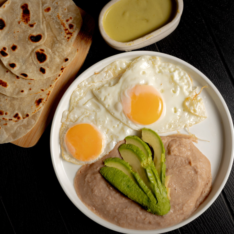 3 huevos revueltos con tomate, cebolla y chile serrano. Incluye guarnición de frijoles y 2 tortillas de maíz o harina.