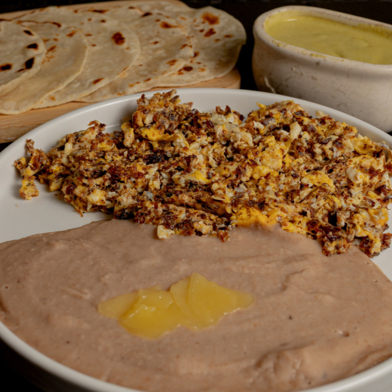 3 huevos, machaca salteada a la perfección con cebolla, chile serrano y jitomate. Servida con frijoles refritos, 2 tortillas de harina y 2 de maíz.