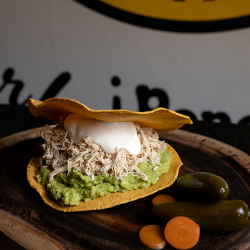2 Tostadas (20cm) grande de maíz con base de guacamole (120g), de pechuga de pollo deshebrada, y un toque de crema ácida. Acompañada de jalapeños en vinagre.