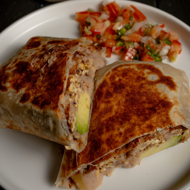 Tortilla de harina de gran tamaño (25 cm) rellena de machaca con 3 huevos (tomate, cebolla y chile serrano), aguacate y queso manchego, base de frijoles y acompañado de salsa picante de la casa por separado.