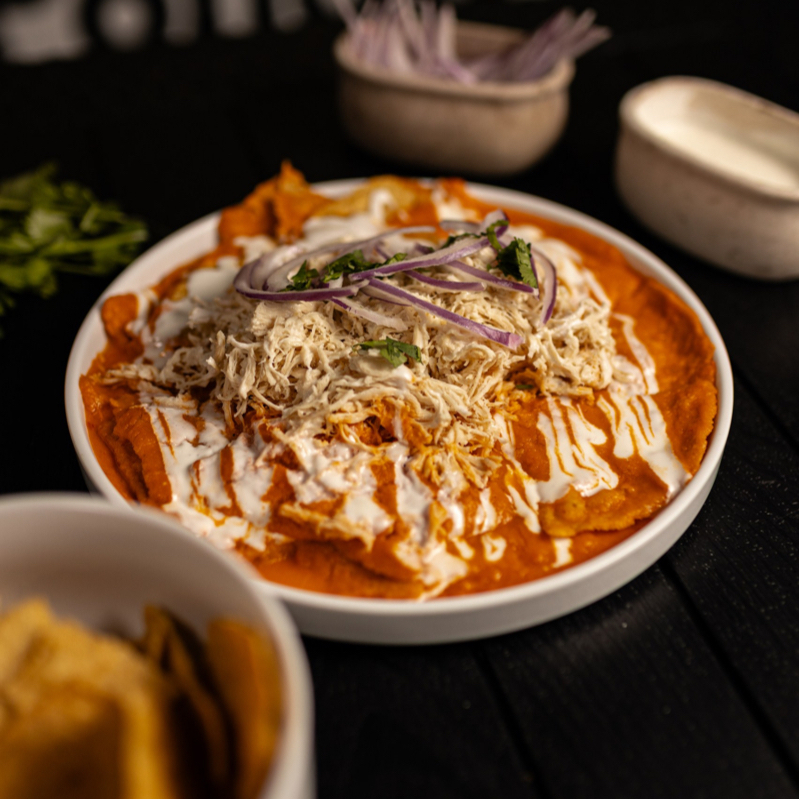 Totopos de maíz bañados en salsa roja especial (no pica/picor medio). Preparados con crema, queso y cebolla. Incluye frijoles refritos y una proteína a elegir pollo o huevo.
