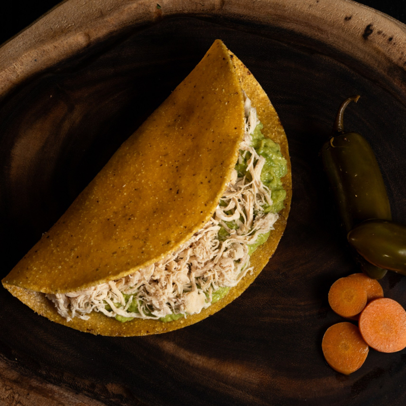 Taco en tortilla de maíz (20 cm) con pollo deshebrado (90g), guacamole fresco y crema ácida. Se acompaña de chiles en vinagre.
