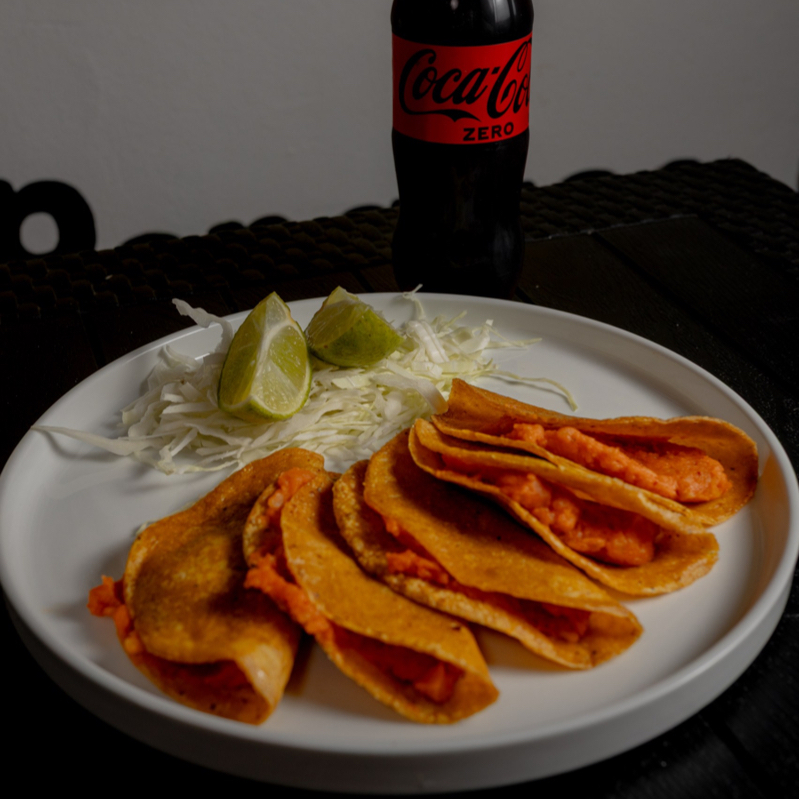 Tacos suaves de tortilla de maíz. Variedad de rellenos a elegir (papa o deshebrada). Acompañados de ensalada de col y salsa.