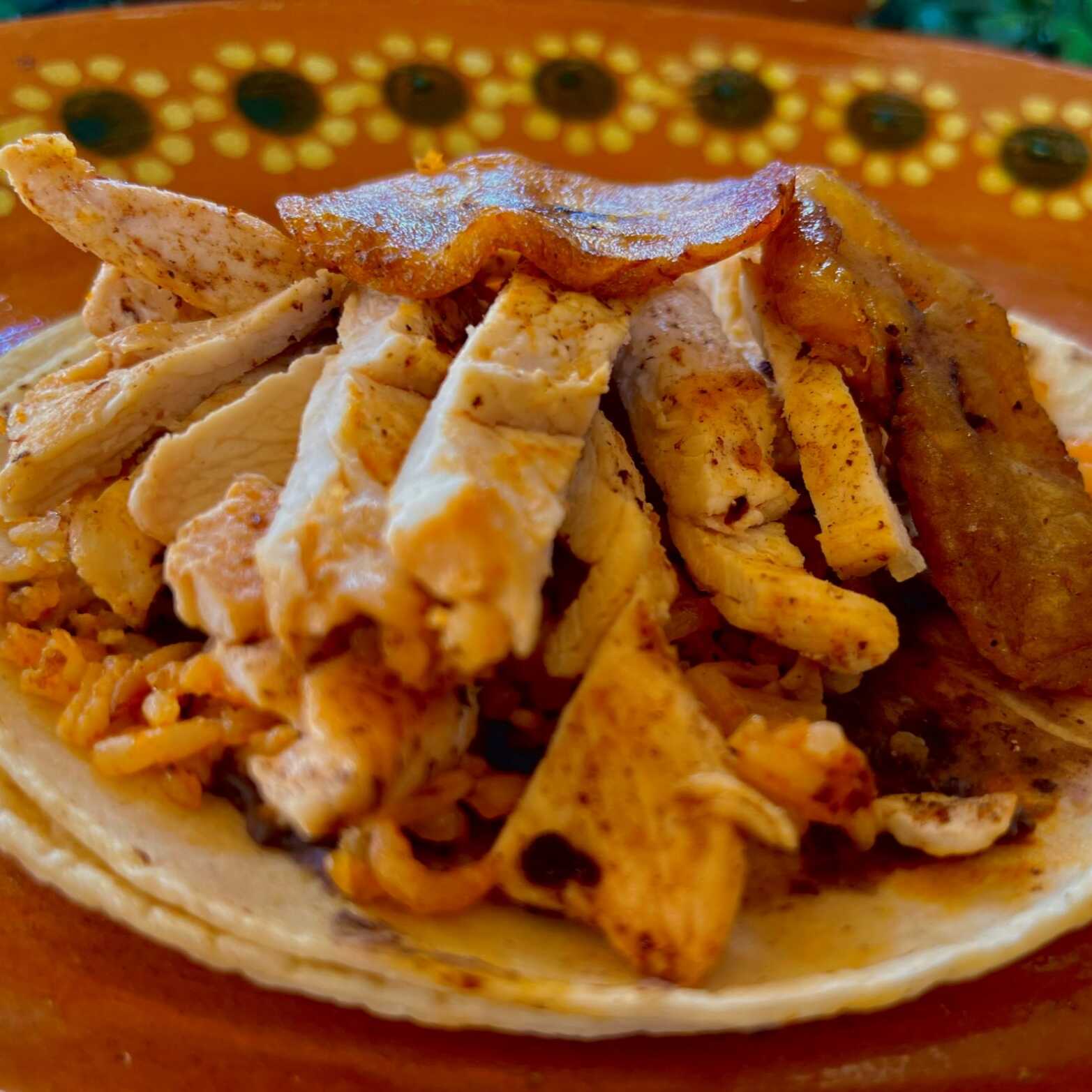 Doble tortilla de maíz, acompañada de frijoles refritos, arroz rojo y el guisado de pollo a la plancha con dos rebanadas de plátano frito.