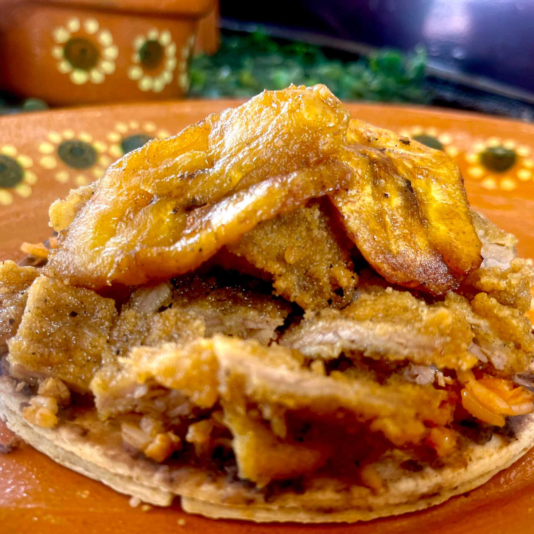 Doble tortilla de maíz acompañada de frijoles refritos, arroz rojo y el guisado de empanizado de cerdo junto con dos plátanos fritos.