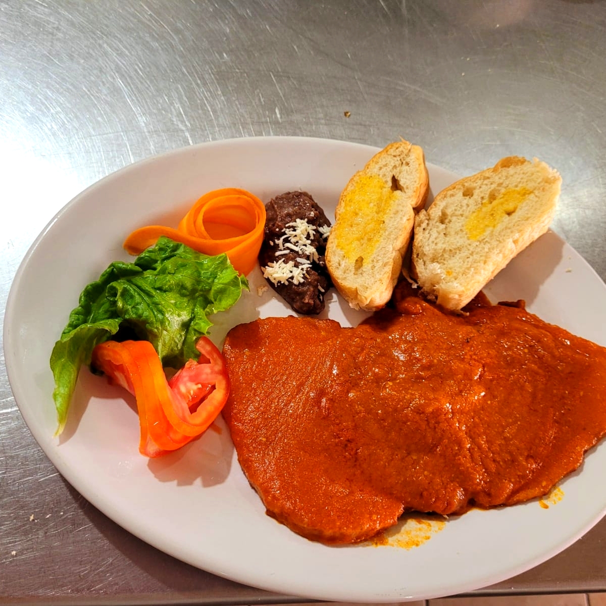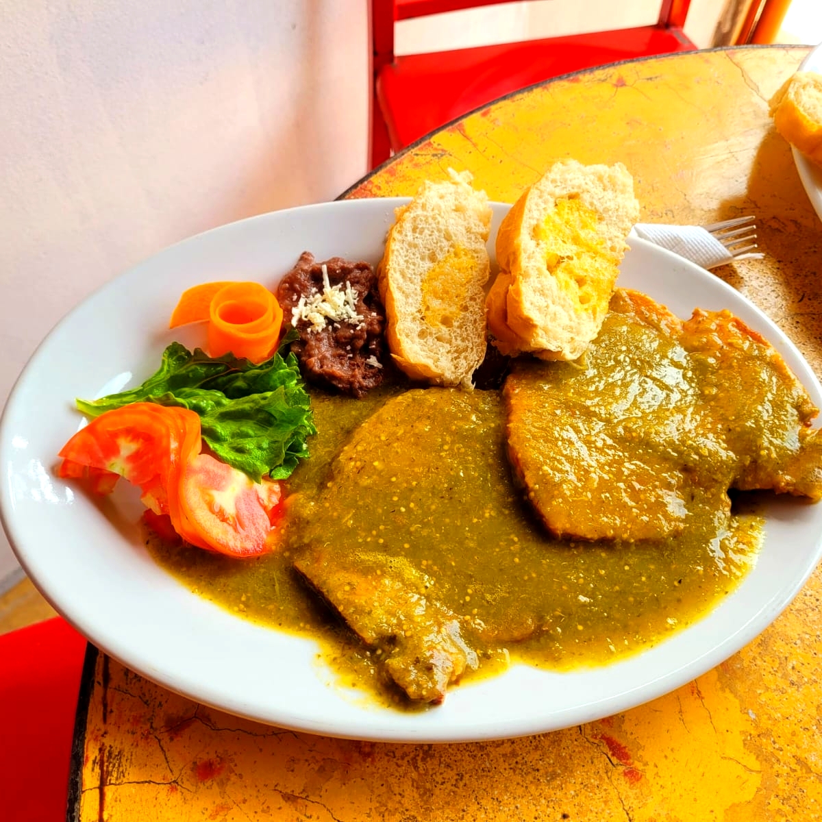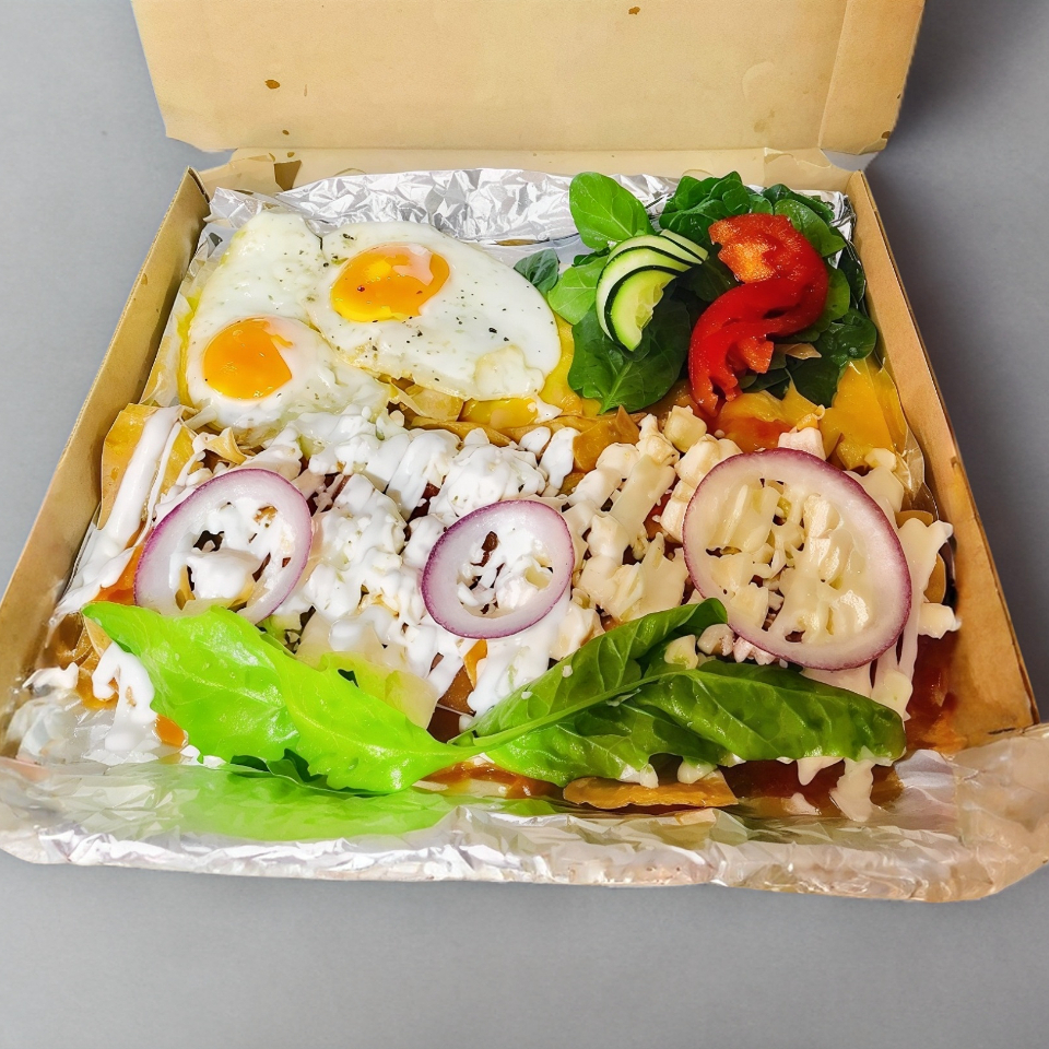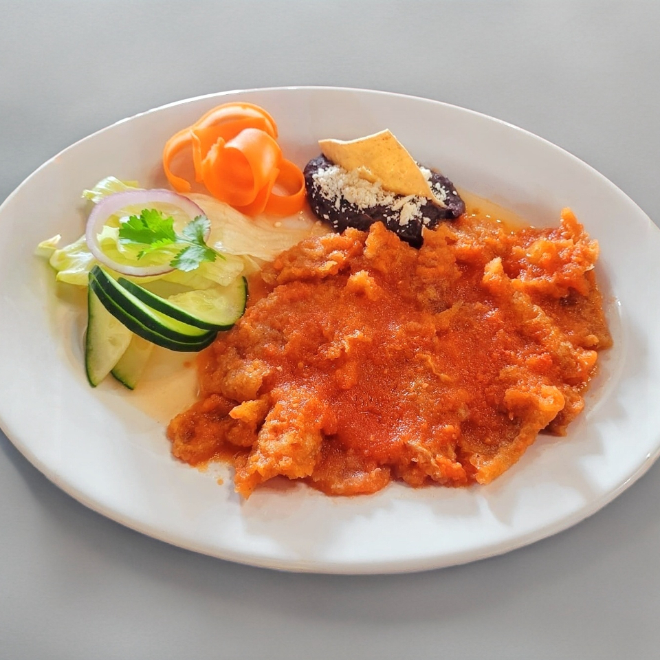 150 grs de totopos bañados en salsa de guajillo entre otros chiles, 2 huevos estrellados, acompañados de ensalada y frijoles