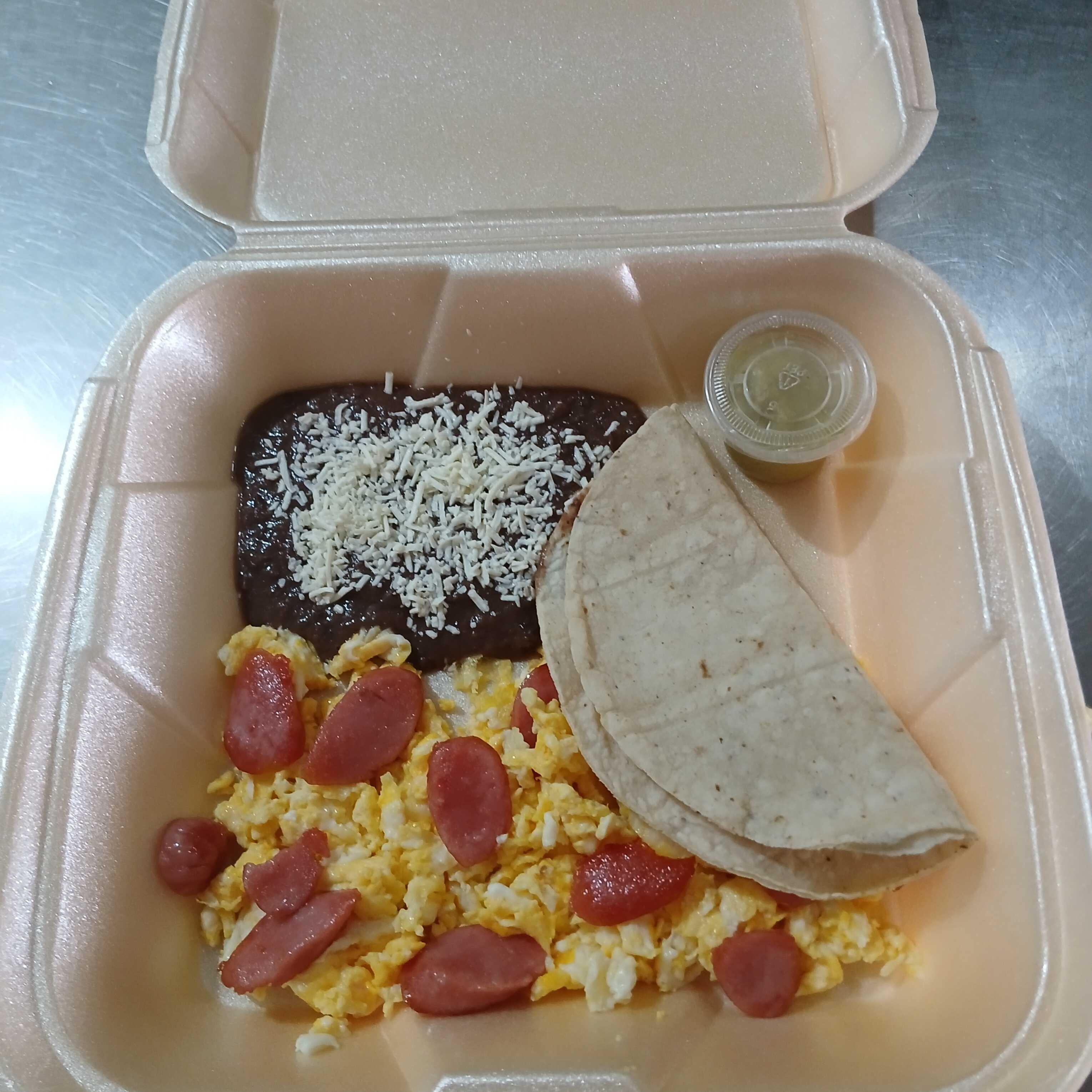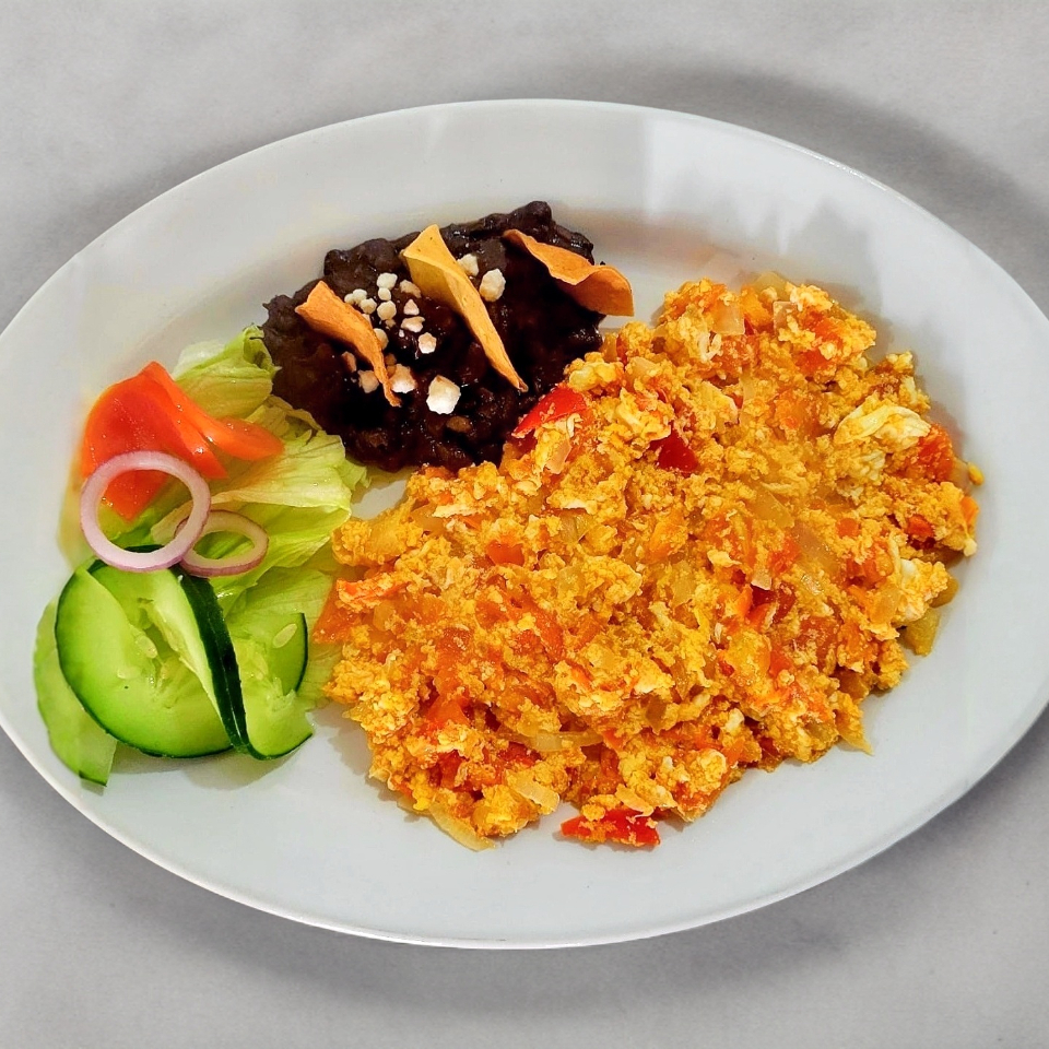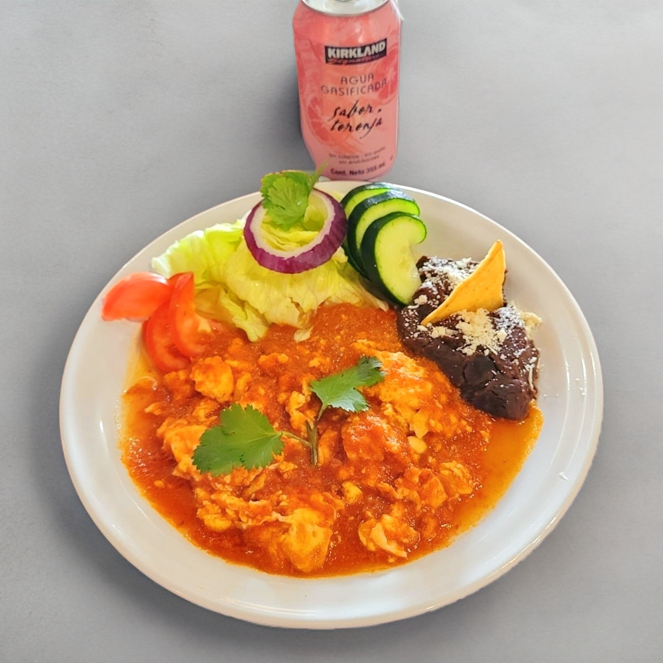 Exquisito guiso de Jitomate rojo, cebolla blanca, con un toque especial de la casa, 3 huevos, una división que se agrega una pequeña ensalada, frijoles con queso, 4 tortillas de maíz y salsa picante aparte