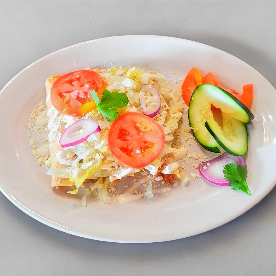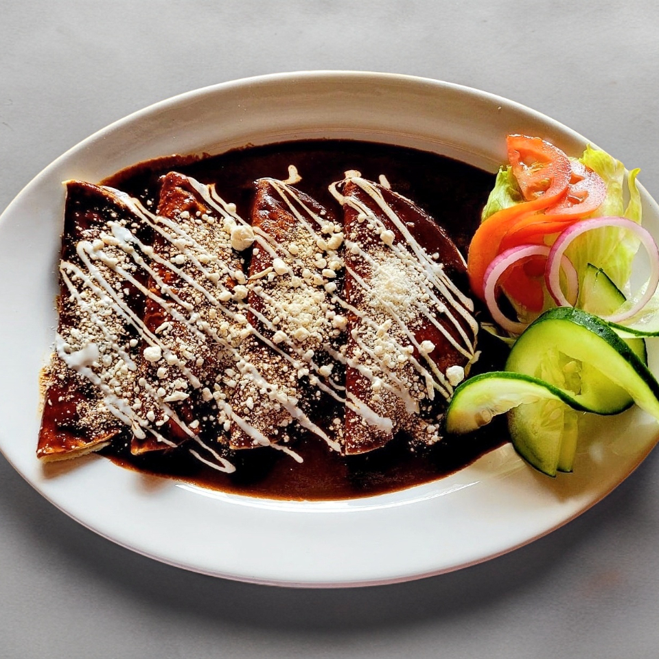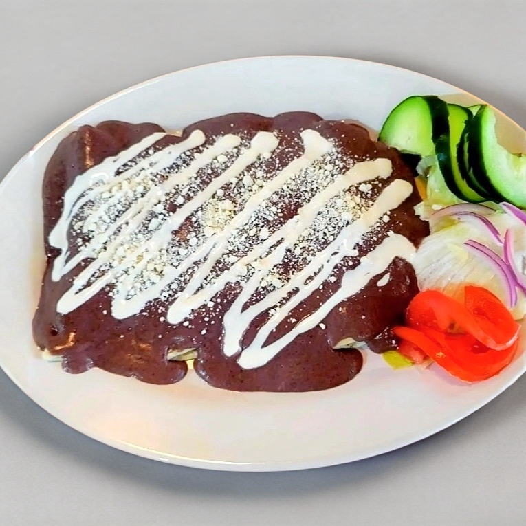 4 Piezas de tortilla de maíz rellenas de pollo deshebrado bañadas en delicioso mole preparado con la receta de la casa con crema y queso acompañadas de una porción de frijolitos refritos y ensalada fresca.