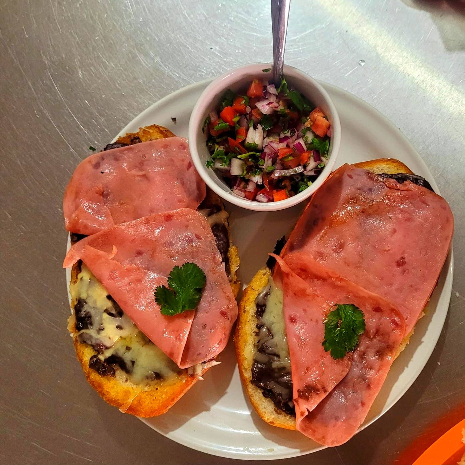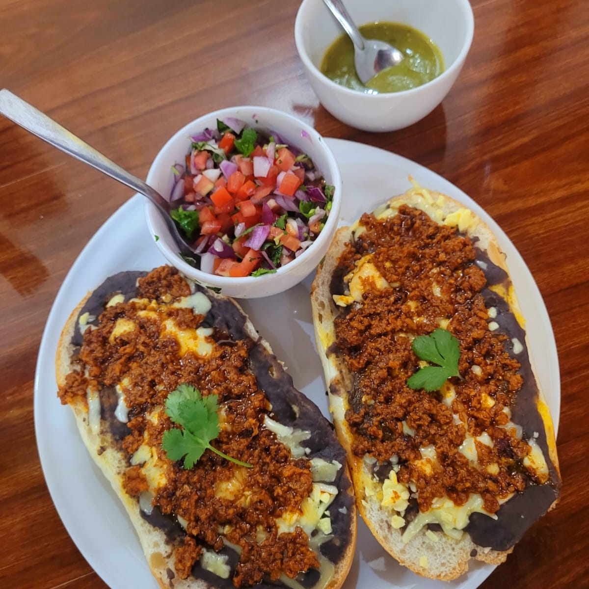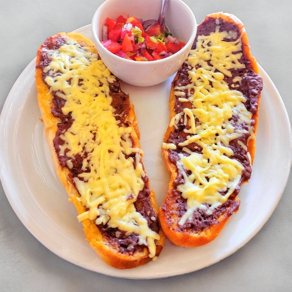 Pan de horno de leña calentado en plancha con mantequilla, una cama de frijoles negros de olla y sofreidos, queso derretido, longaniza, pico de gallo y salsa picante aparte