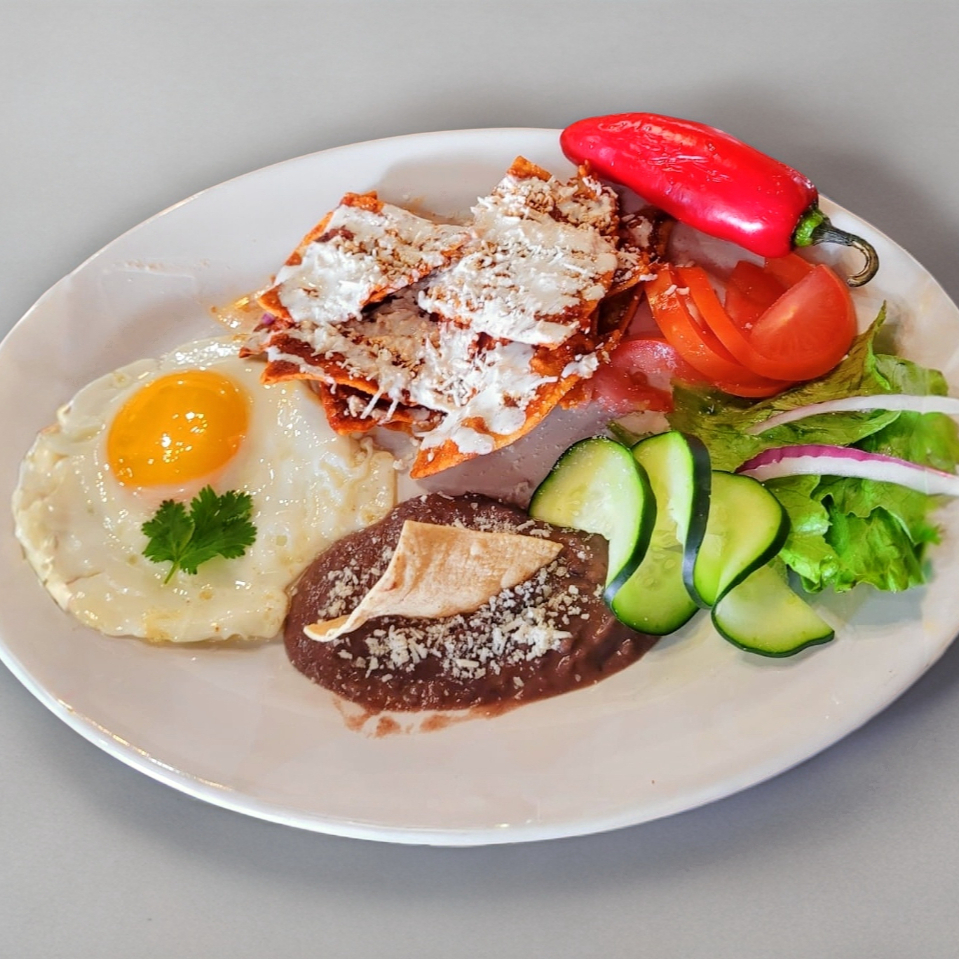 Deliciosos chilaquiles rojos (no pican) con 1 pieza de Huevo estrellado, frijol con queso y picante aparte