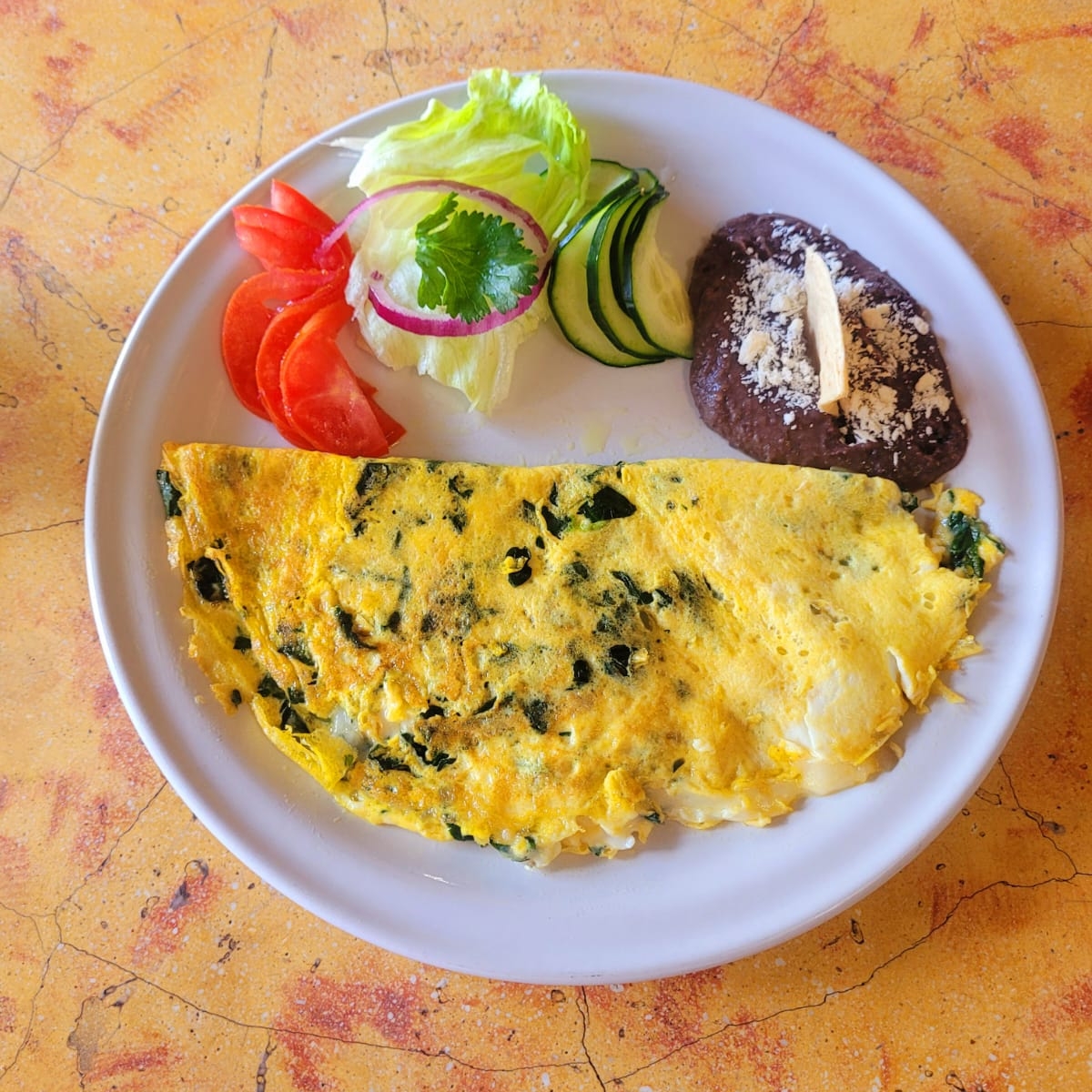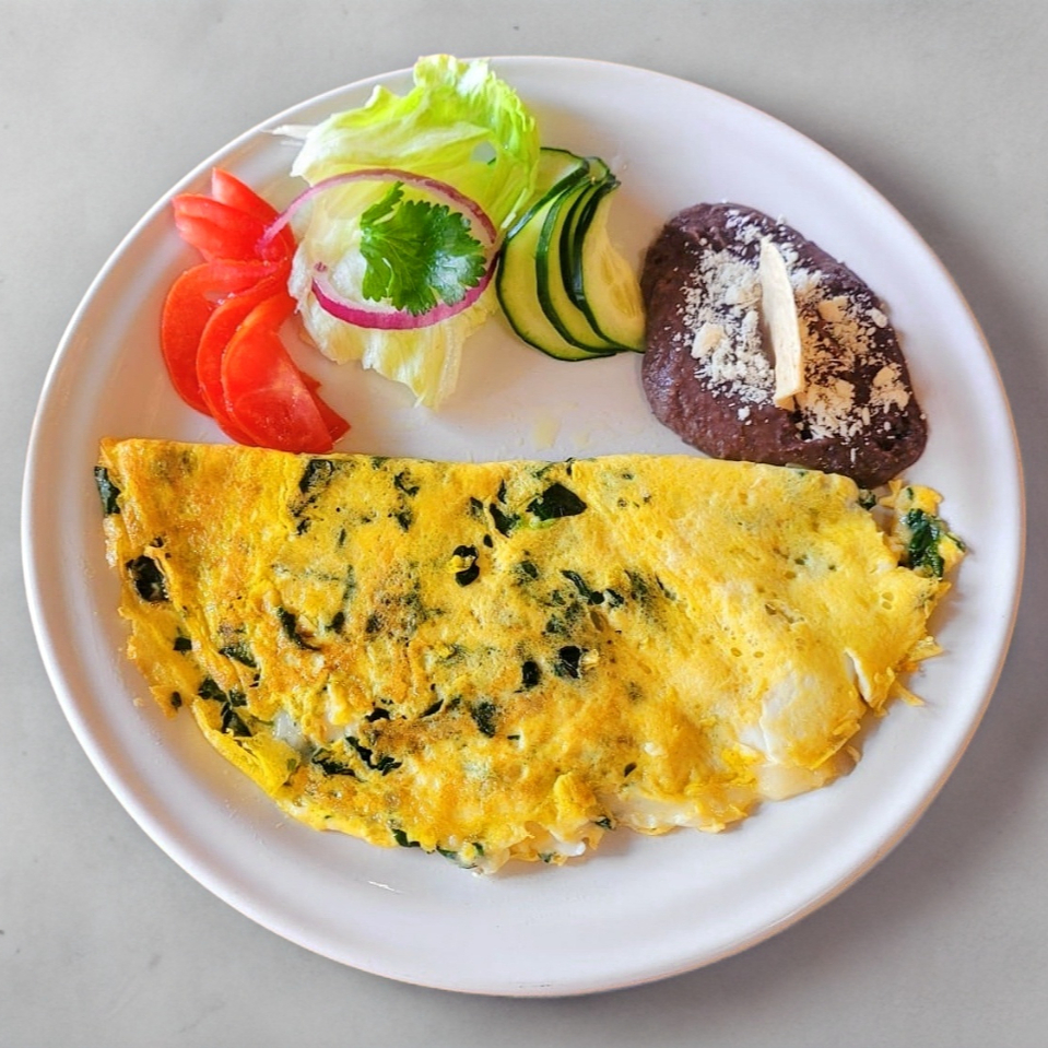 Huevo en omelette con espinaca y queso cheddar, ensalada, frijol con queso tortillas y Salsa de habanero aparte