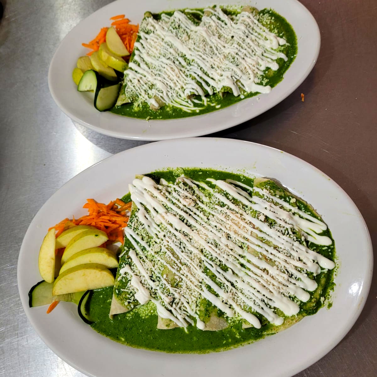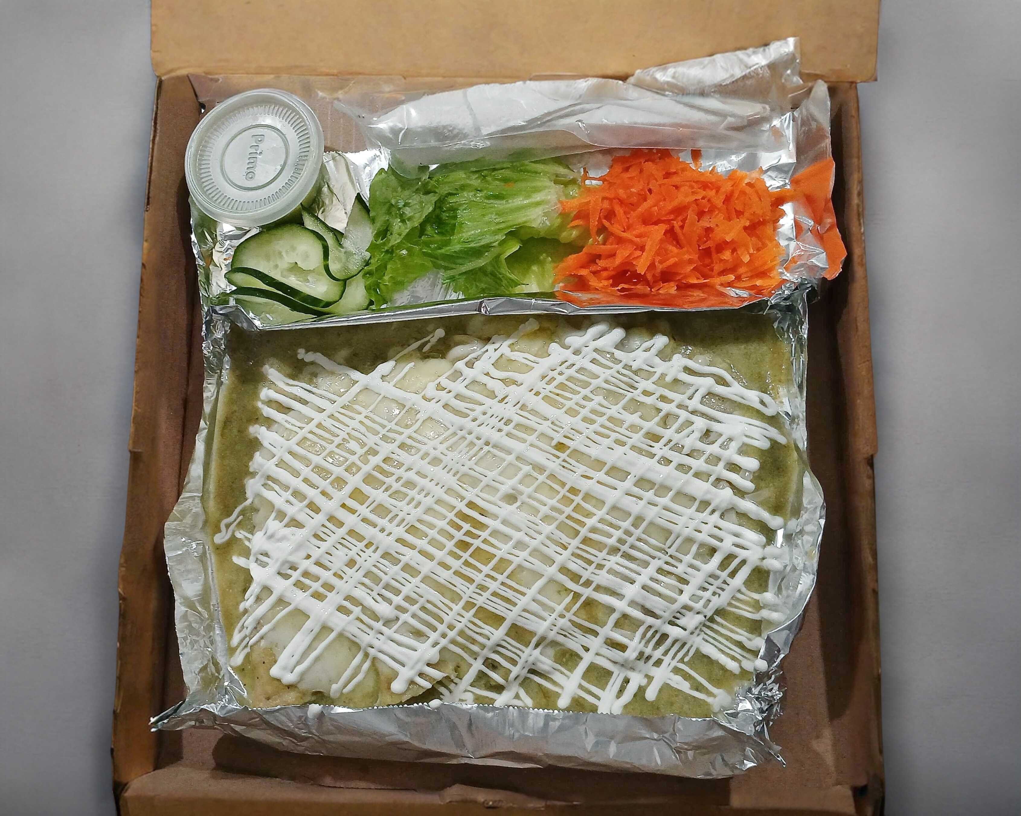 Exquisitas 4 enchiladas rellenas de pollo en Salsa verde, queso cheddar, crema, ensalada, salsa picante aparte, productos de calidad