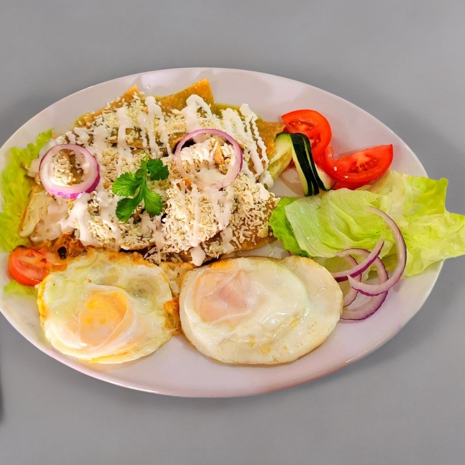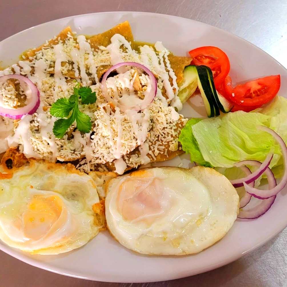 150 g De totopos bañados en la salsa de tu elección con 2 pzas de huevo, crema y queso acompañados de una porción de frijolitos refritos y ensalada fresca.