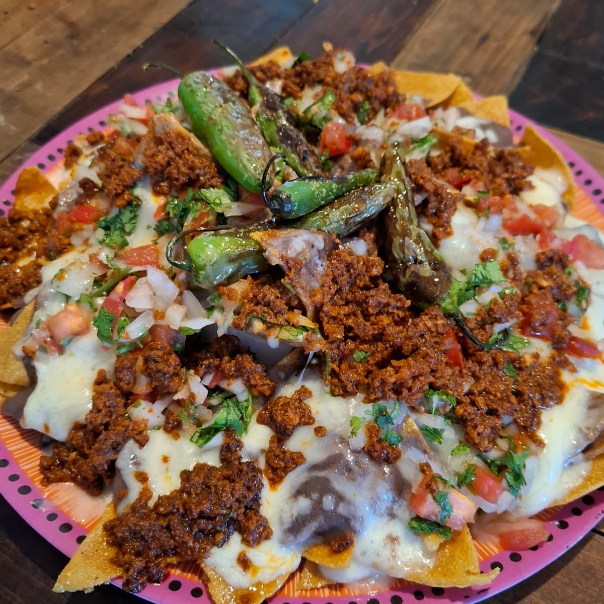 200 Gramos de totopos, 250 Gramos de Chorizo de calidad, se bajan con frijol colado y queso cheddar pico de gallo aparte al igual que picante para compartir de 3 a 4 personas