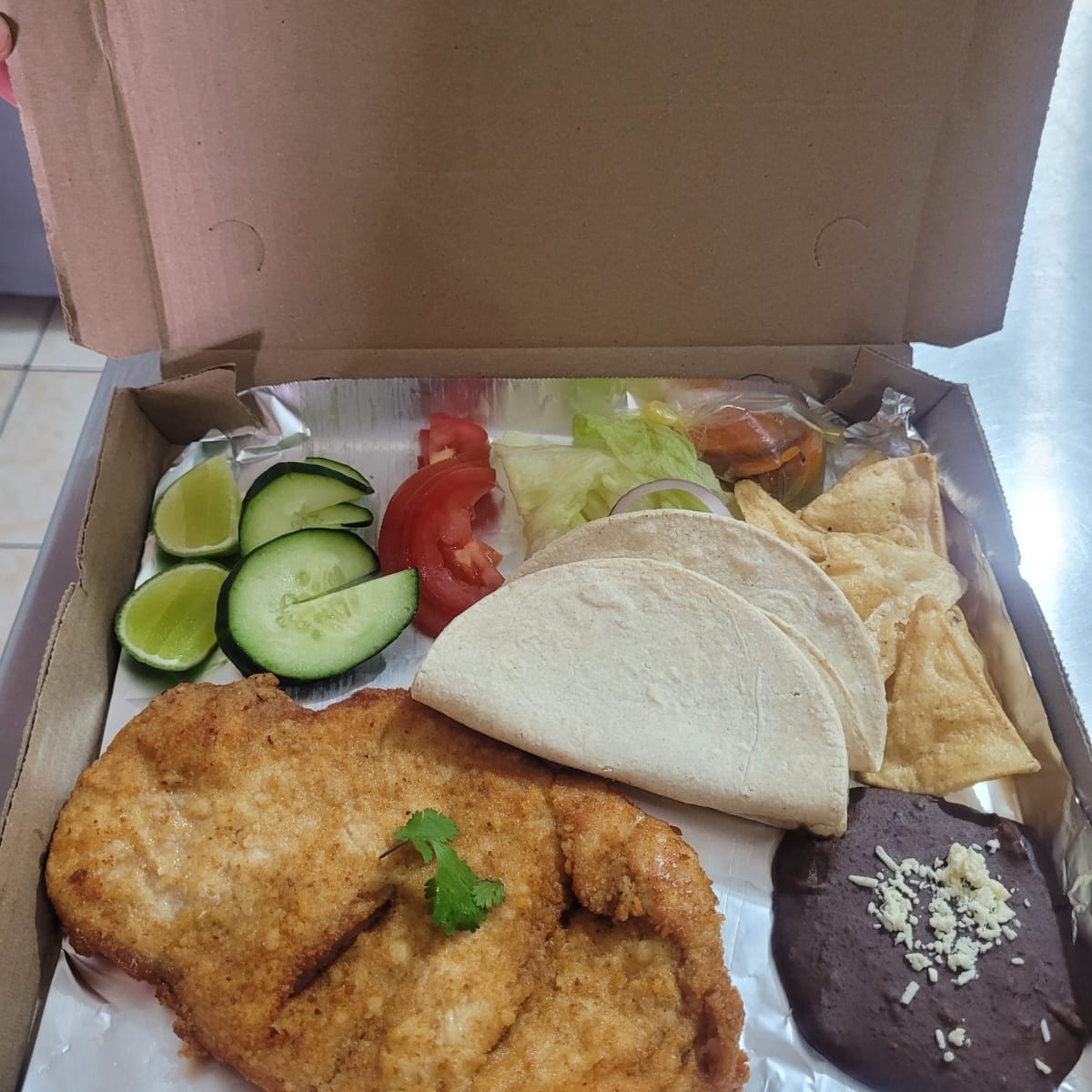 Lleva una porción de chicharrón, frijol con queso, 4 Tortillas de Maíz y salsa picante aparte