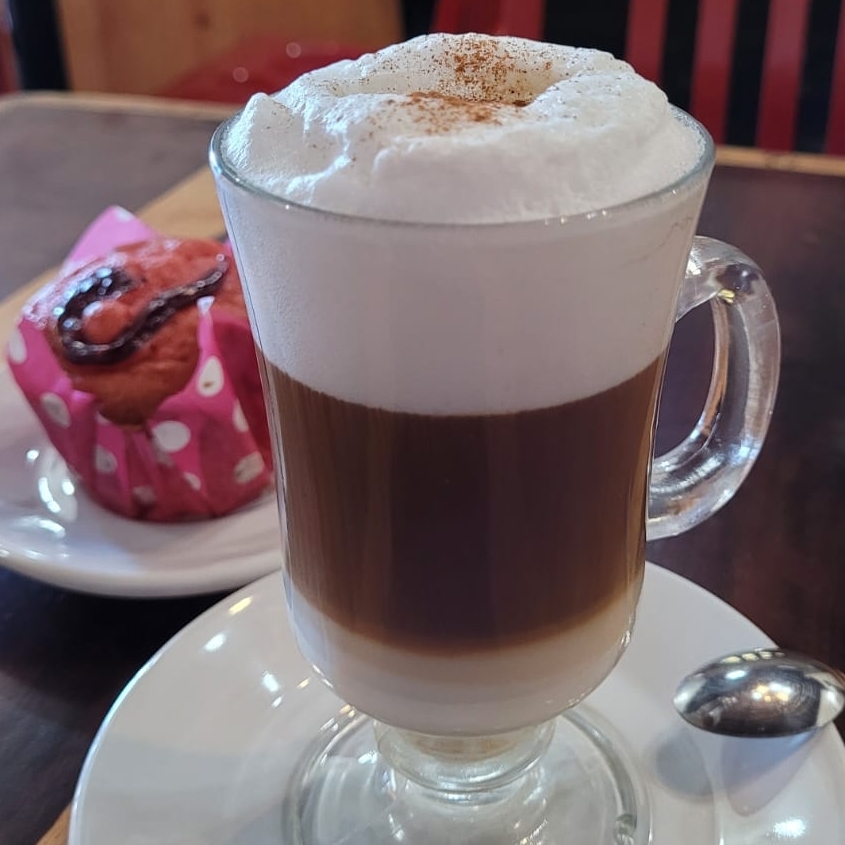Cafe de grano recien Molido en maquina de cafe profesional con leche de su eleccion deslactosada o entera, sabor cajeta, mazapan y moka
