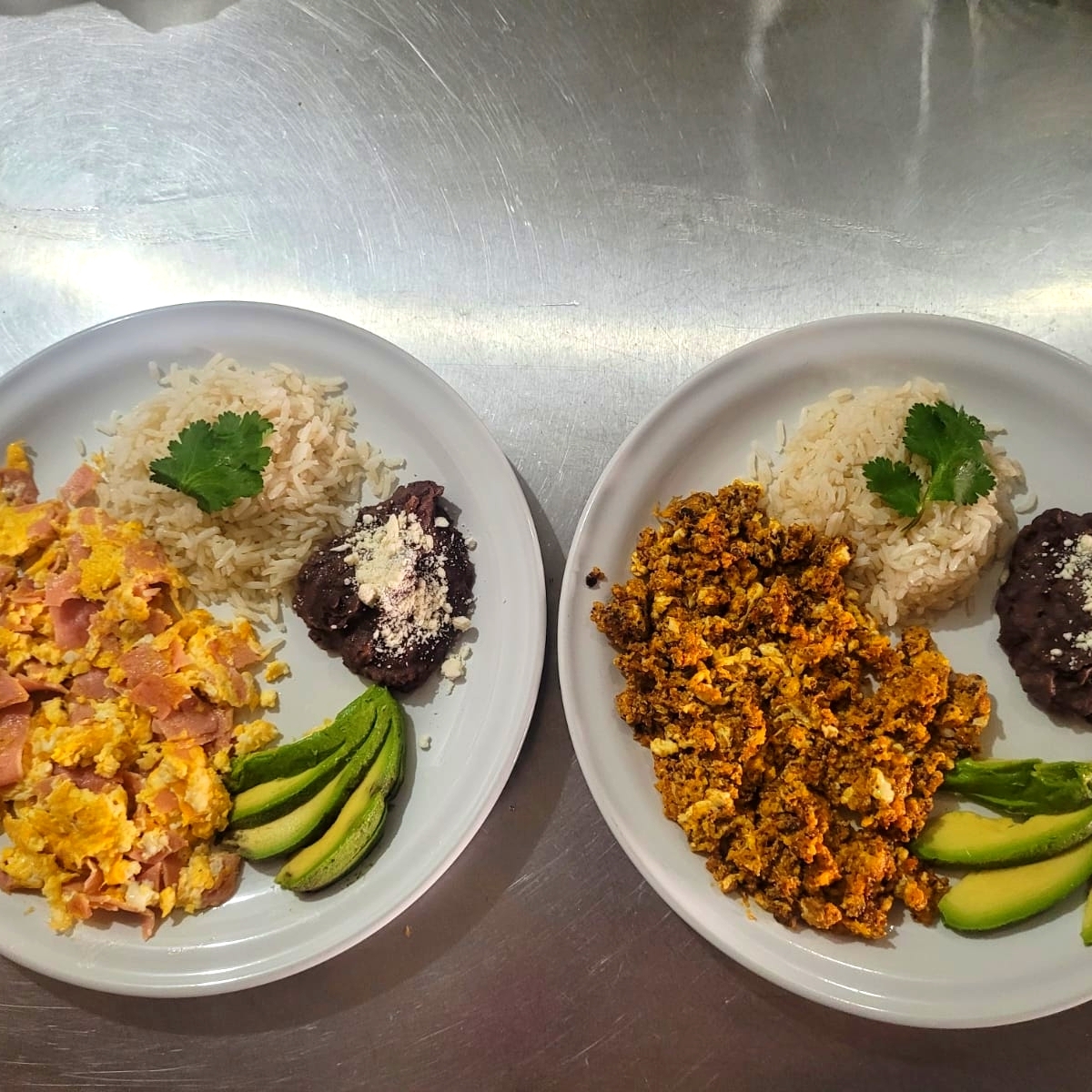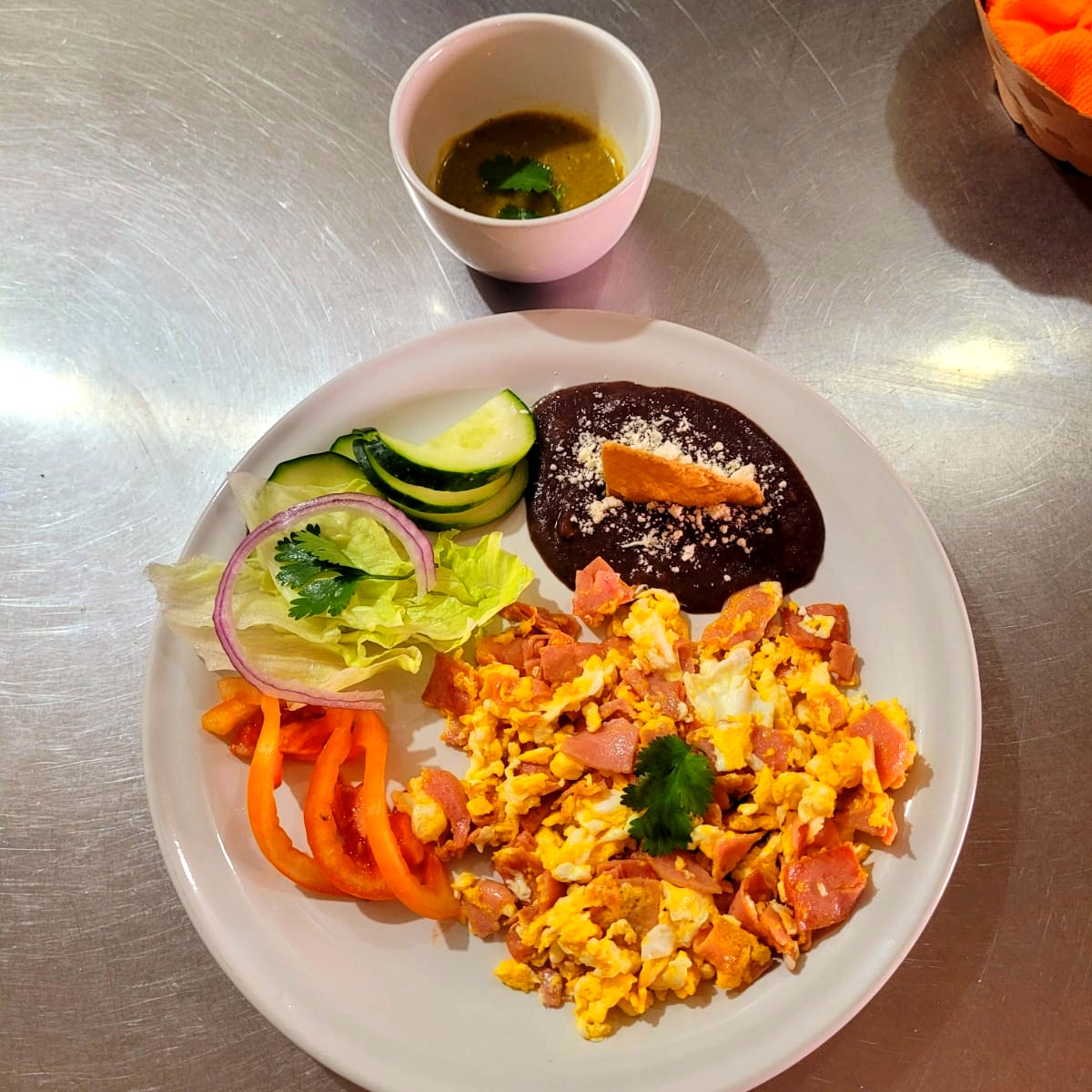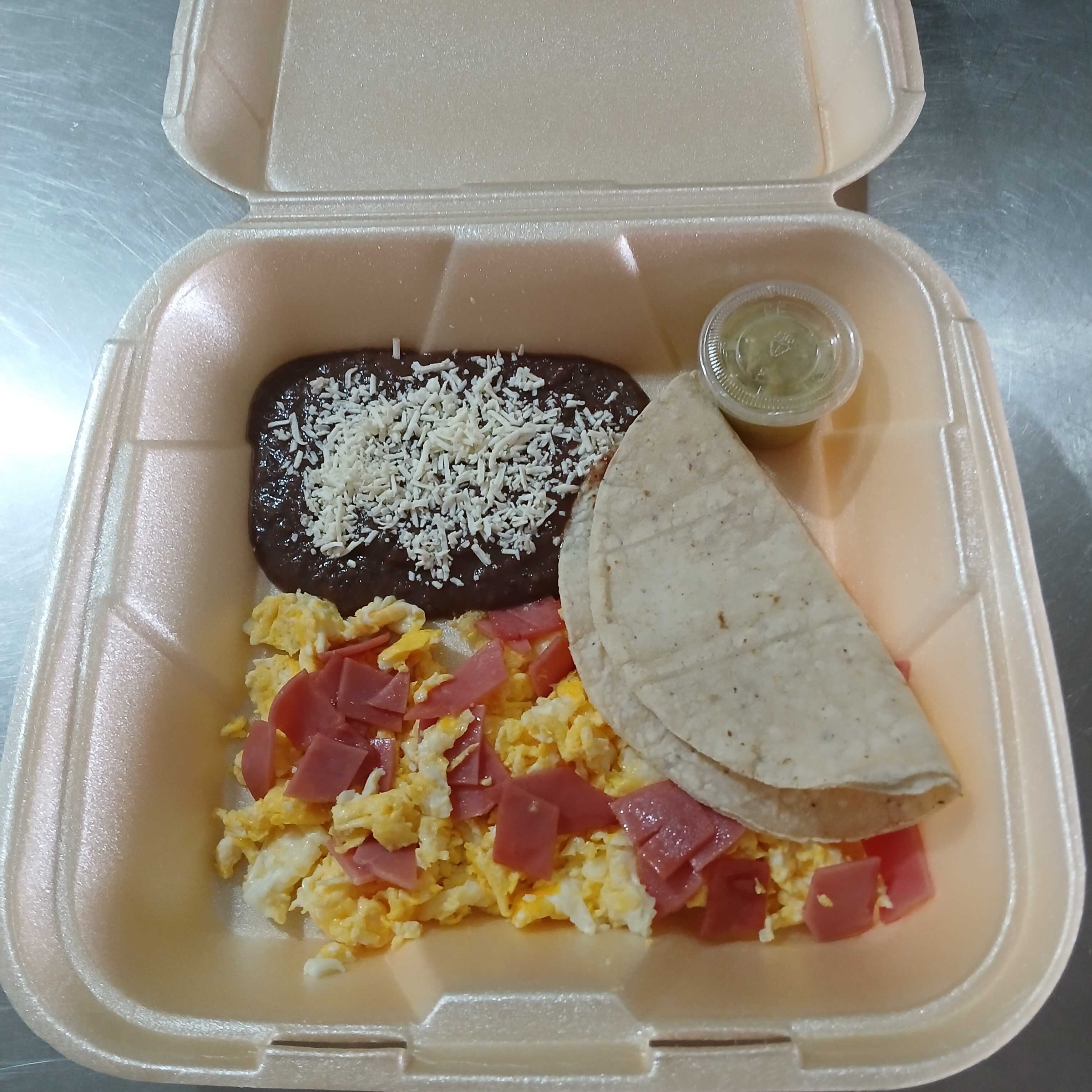 Desayuno de campeones, 3 piezas de huevo revuelto con jamón de calidad, una división con una ensalada, frijol con queso, 4 tortillas de maíz recién echas y salsa picante aparte SALUDABLEMENTE