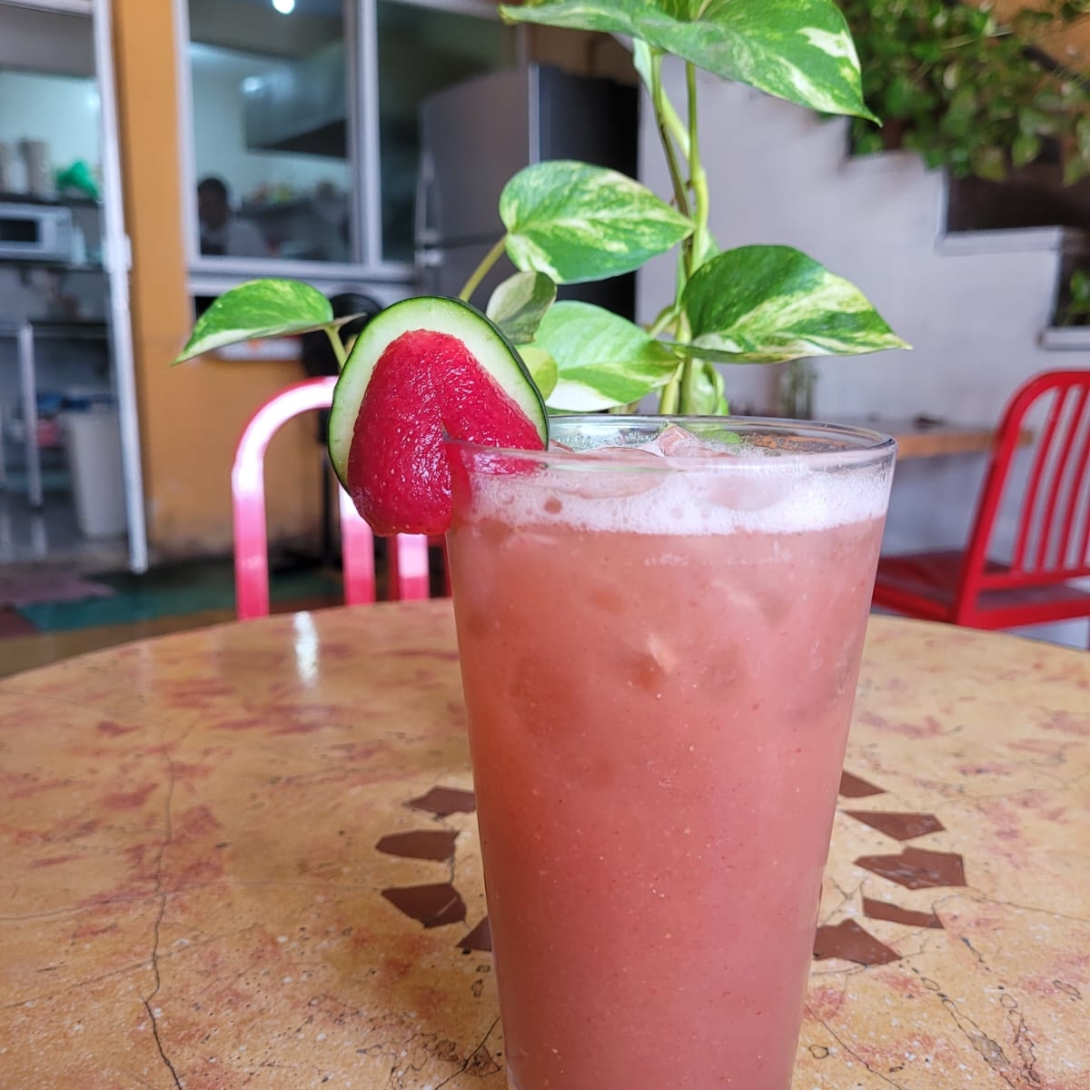 Agua de fruta natural pepino.y fresa 1 litro con hielo