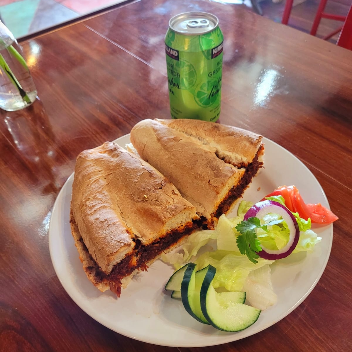 Telera grande con una cama frijoles refritos, mayonesa, lechuga, cebolla, tomate, calentada en plancha con mantequilla y crema de habanero aparte